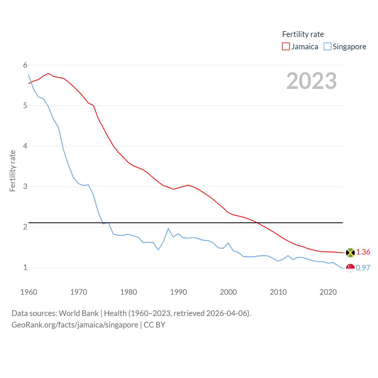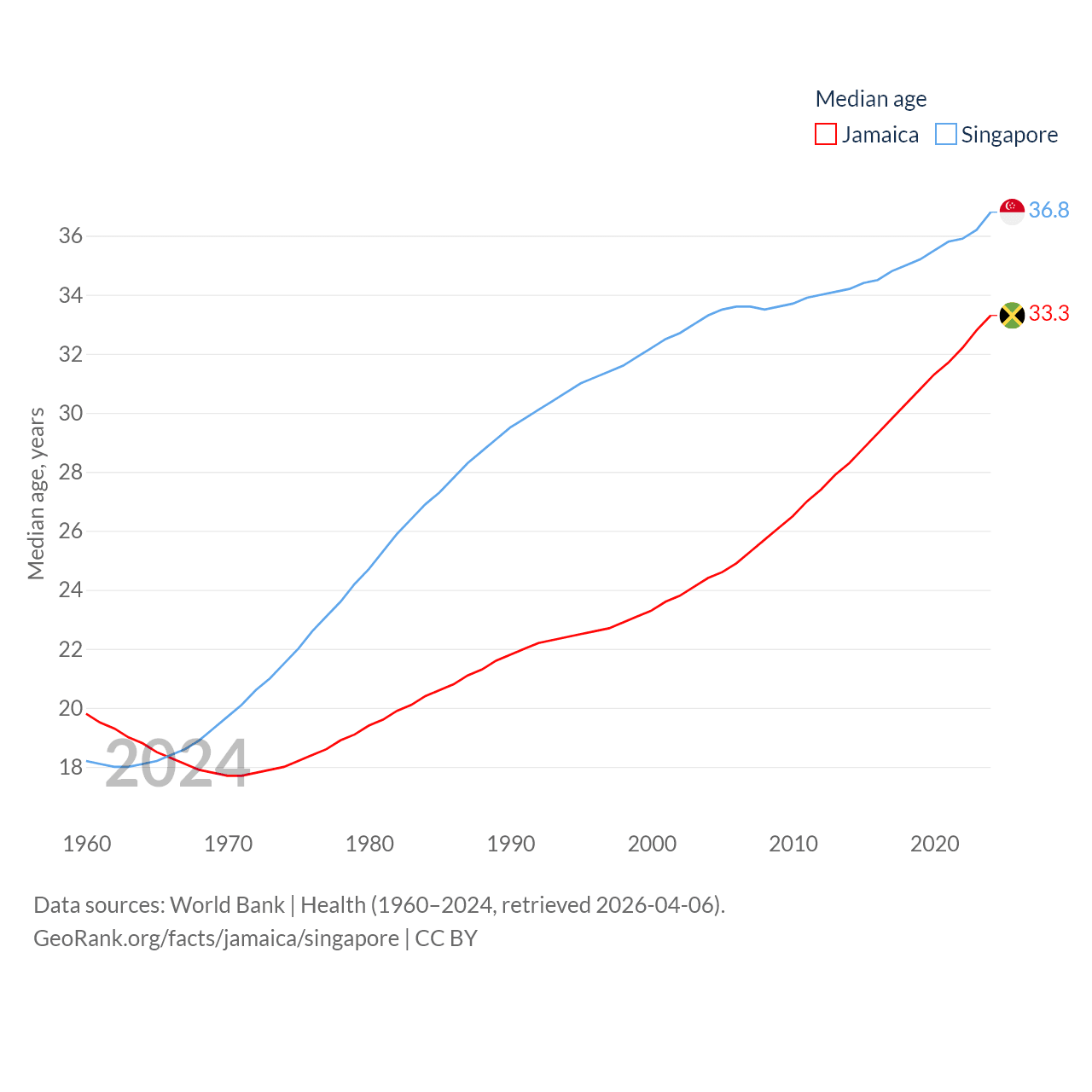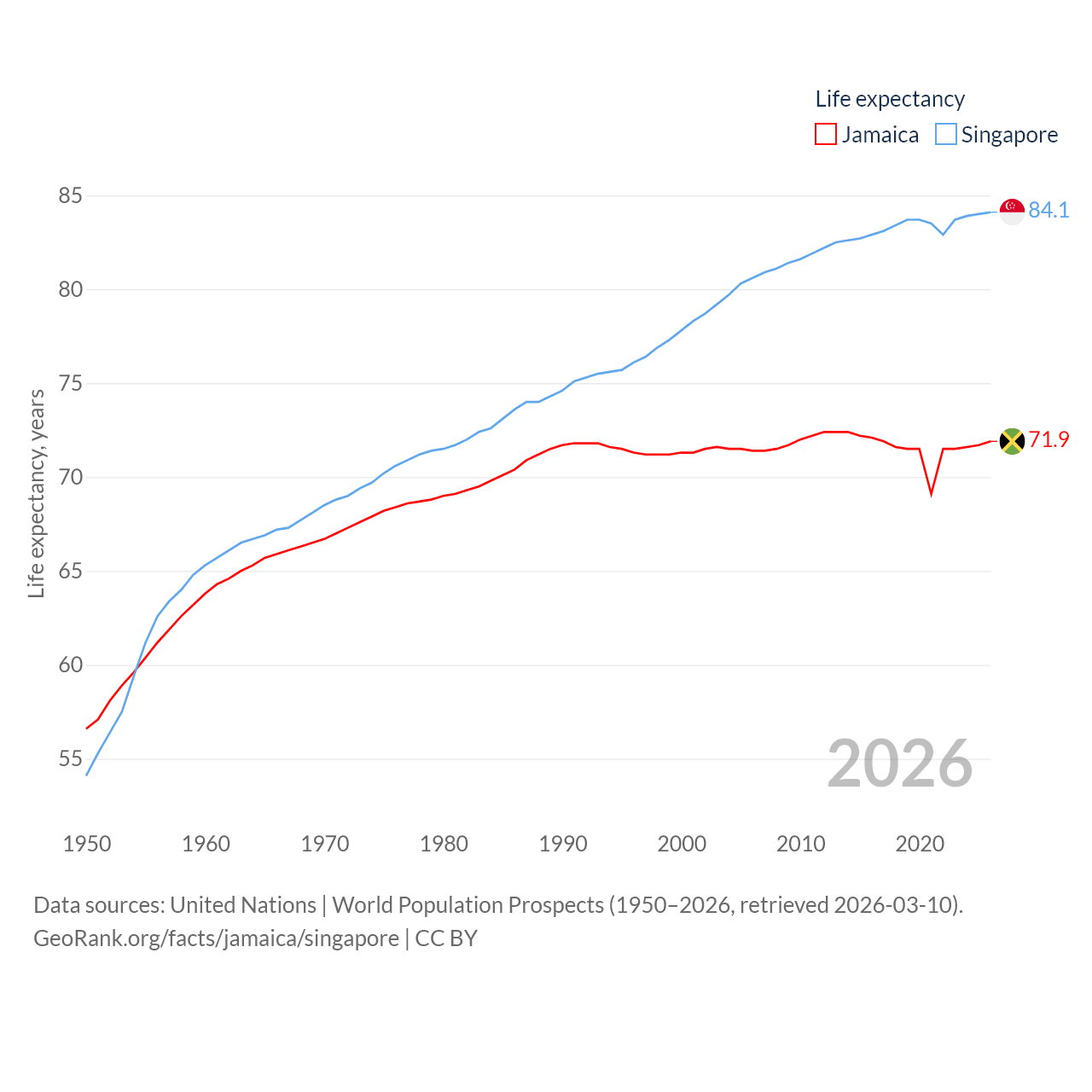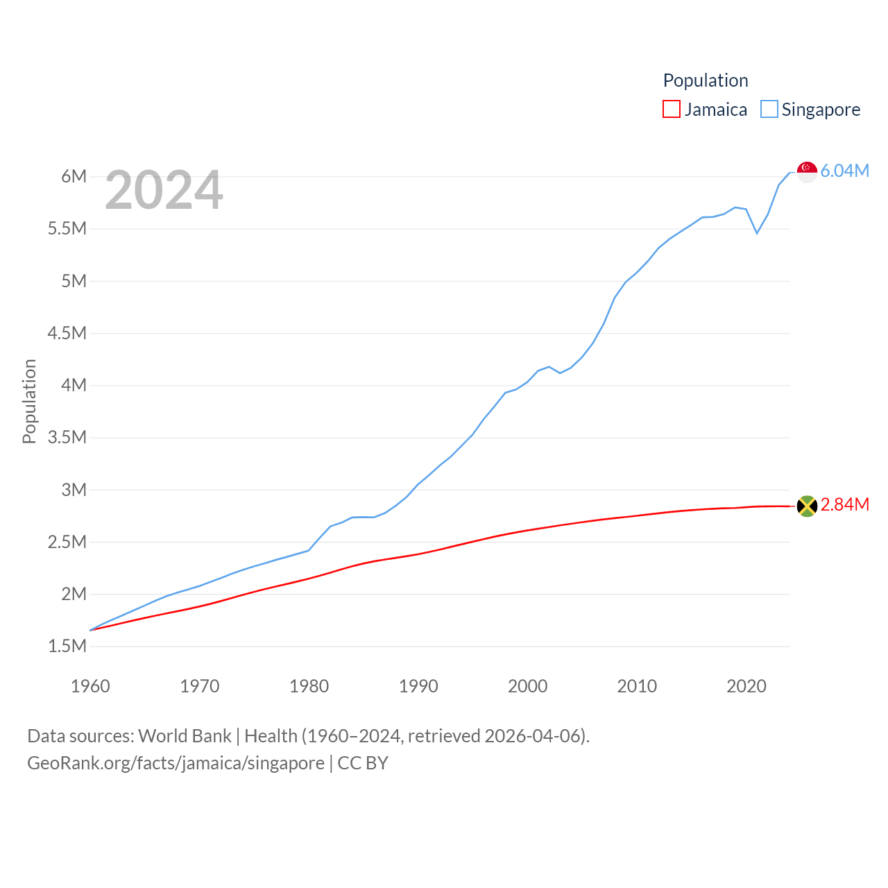 Jamaica has a population of 2.84M (ranked 139/197), compared with 6.04M in Singapore (ranked 113/197). Jamaica's land area is 4,181 sq mi versus 277.2 sq mi for Singapore (ranked 159th vs. 177th).