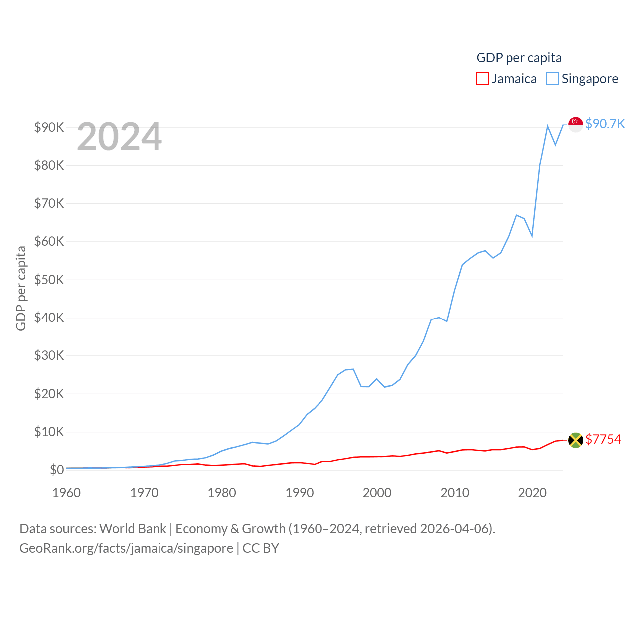 By GDP, Jamaica ranks 124/197 ($22B) and Singapore ranks 28/197 ($547B). By GDP per capita, Jamaica ranks 95/197 ($7,754), while Singapore ranks 7/197 ($90,674).