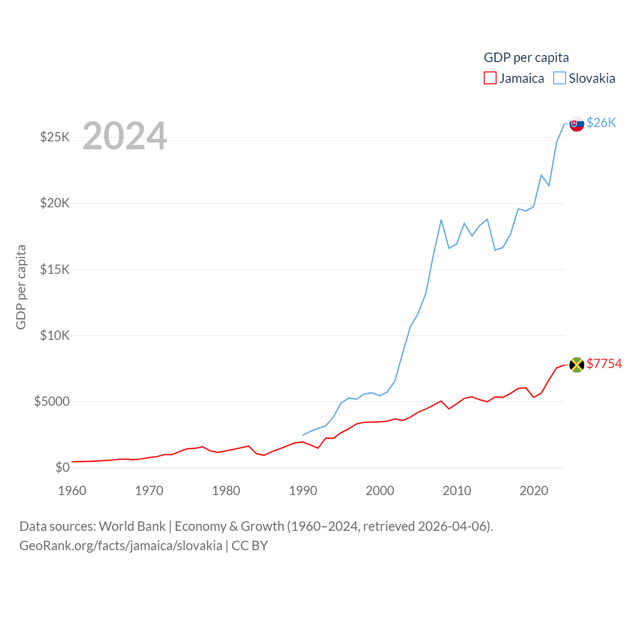 By GDP, Jamaica ranks 124/197 ($22B) and Slovakia ranks 61/197 ($141B). By GDP per capita, Jamaica ranks 95/197 ($7,754), while Slovakia ranks 47/197 ($25,993).