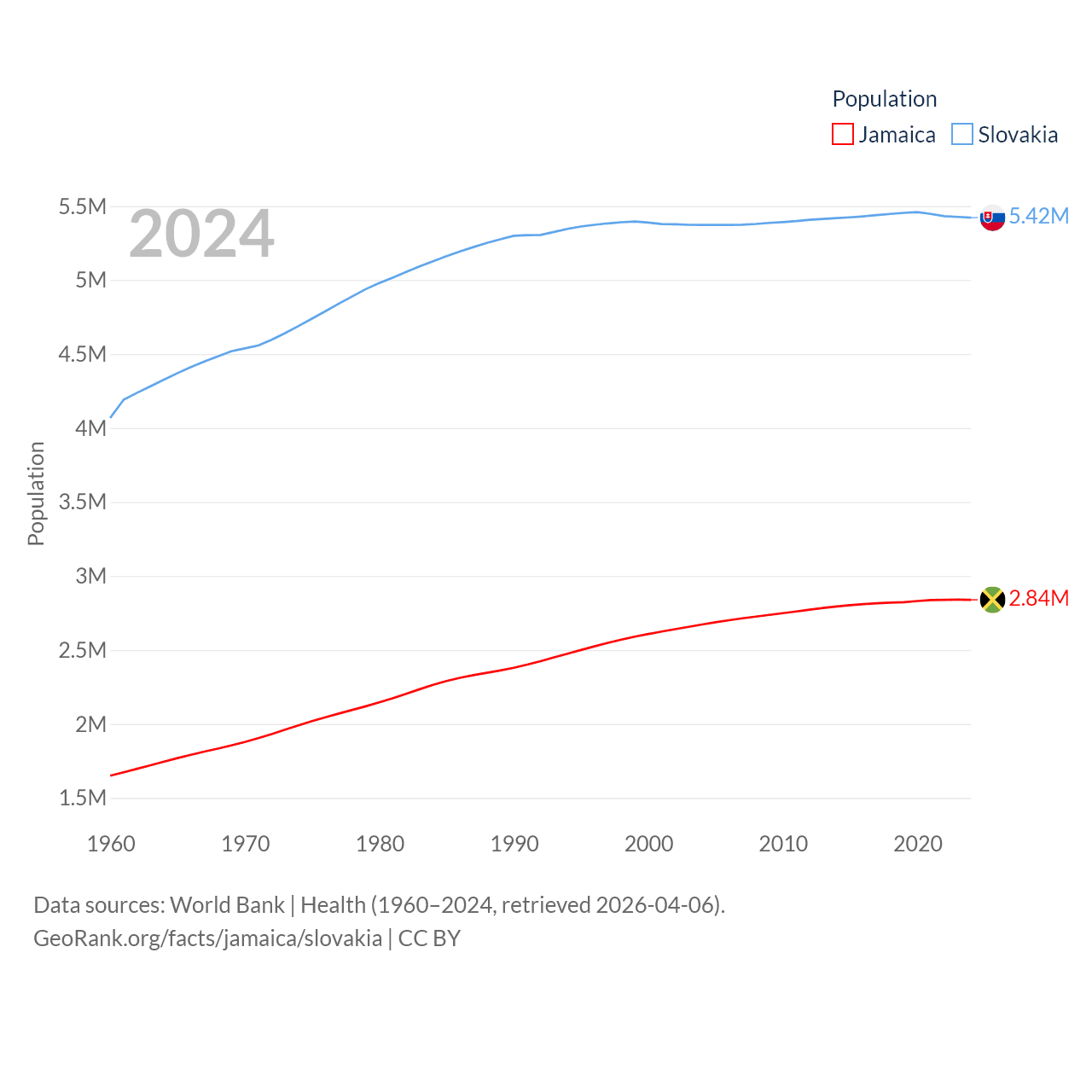 Jamaica has a population of 2.84M (ranked 139/197), compared with 5.42M in Slovakia (ranked 119/197). Jamaica's land area is 4,181 sq mi versus 18,564 sq mi for Slovakia (ranked 159th vs. 128th).