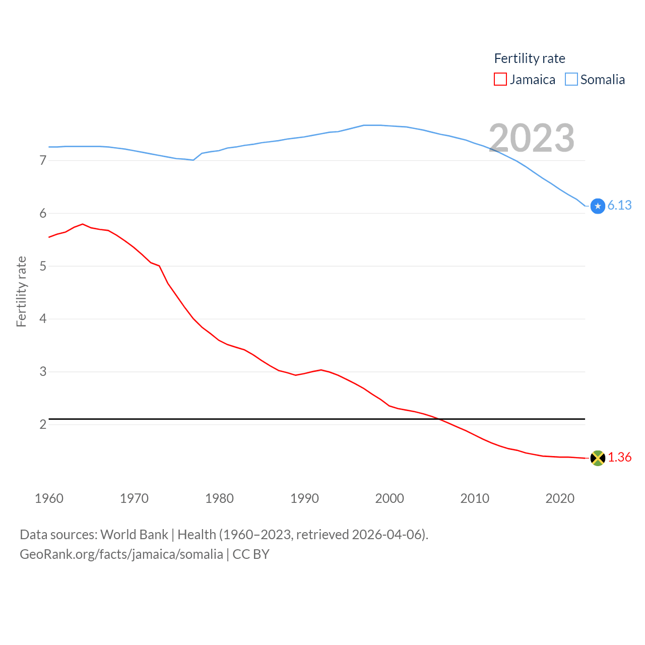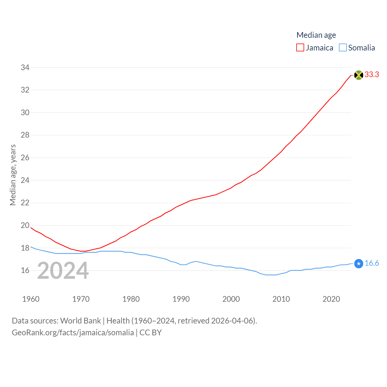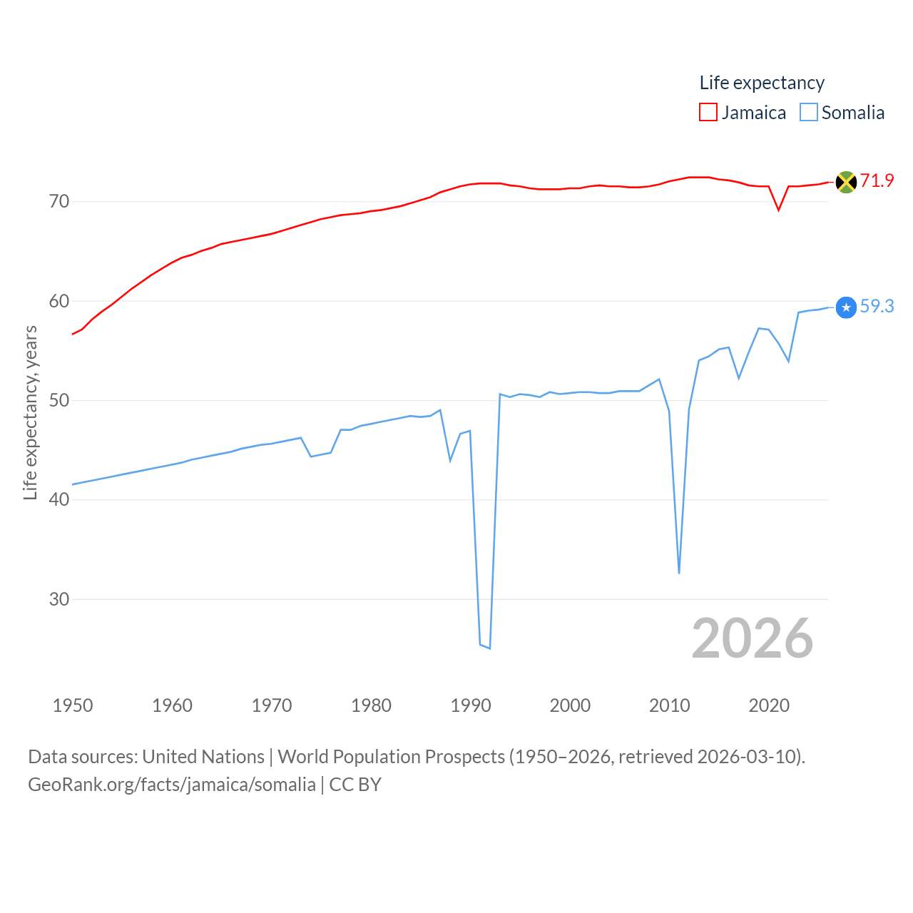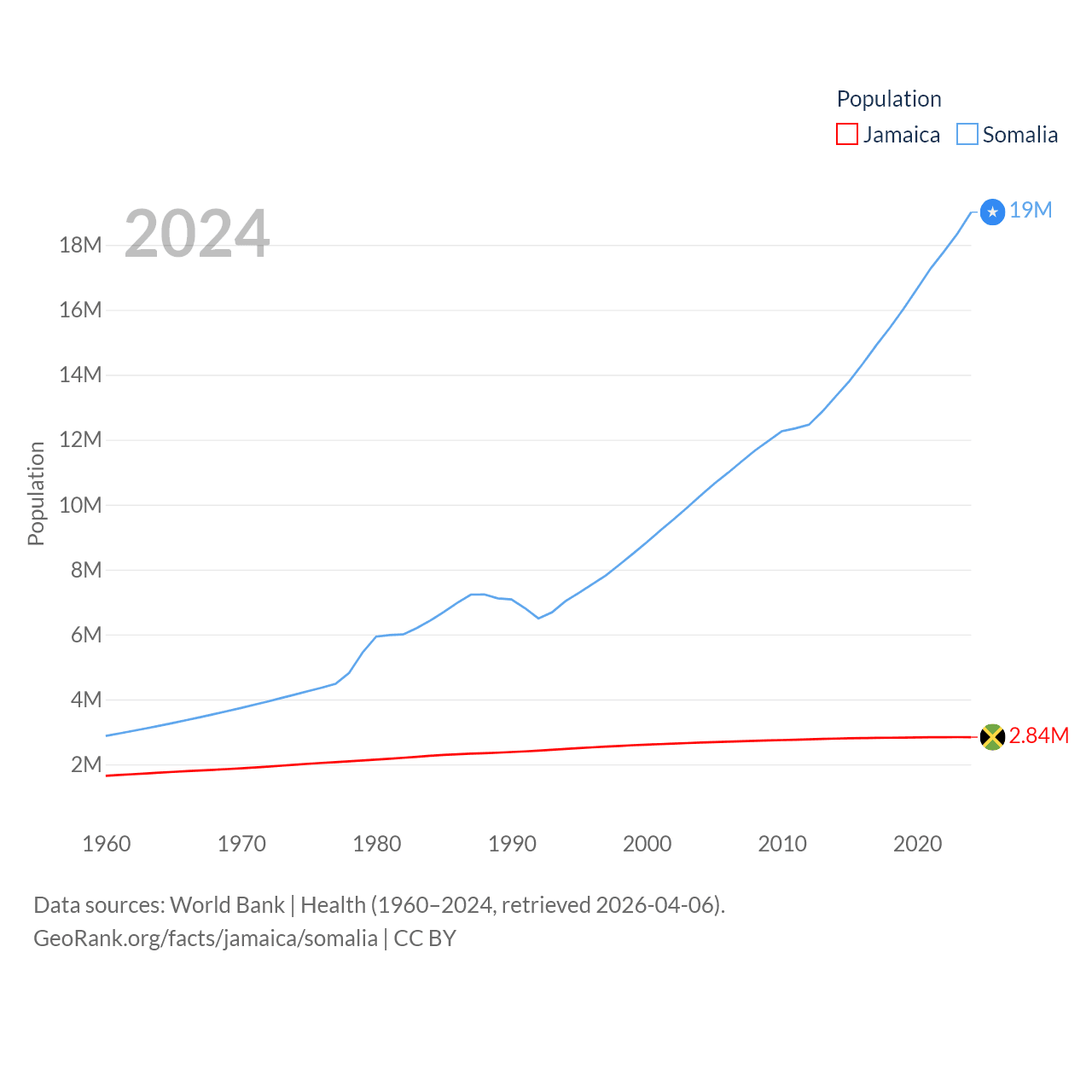 Jamaica has a population of 2.84M (ranked 139/197), compared with 19M in Somalia (ranked 68/197). Jamaica's land area is 4,181 sq mi versus 242,217 sq mi for Somalia (ranked 159th vs. 42nd).