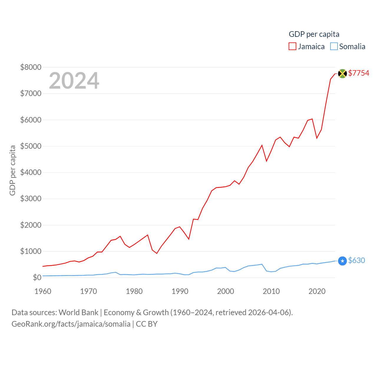 By GDP, Jamaica ranks 124/197 ($22B) and Somalia ranks 150/197 ($12B). By GDP per capita, Jamaica ranks 95/197 ($7,754), while Somalia ranks 192/197 ($630).