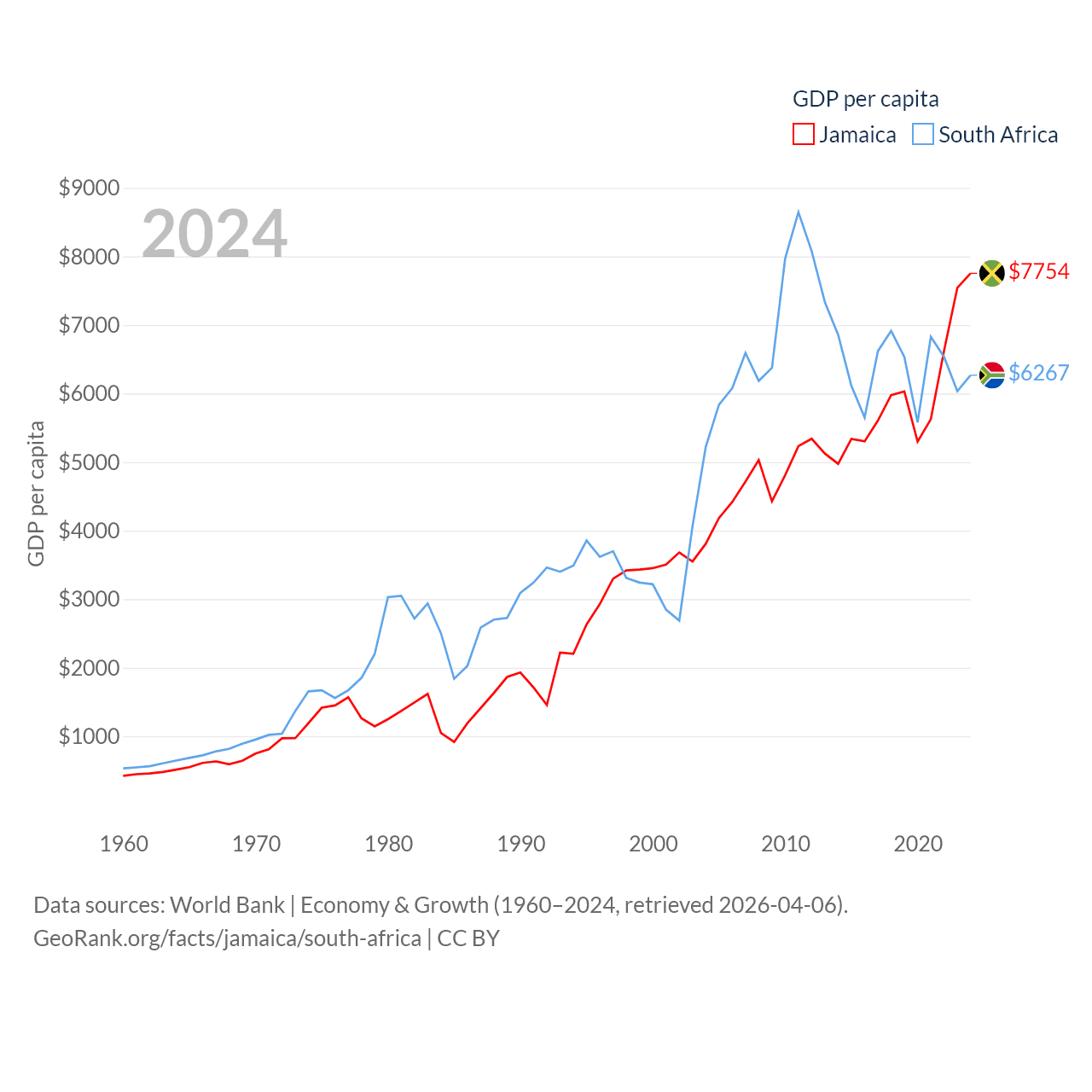 By GDP, Jamaica ranks 124/197 ($22B) and South Africa ranks 40/197 ($401B). By GDP per capita, Jamaica ranks 95/197 ($7,754), while South Africa ranks 111/197 ($6,267).