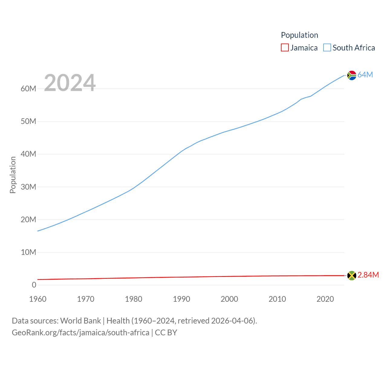Jamaica has a population of 2.84M (ranked 139/197), compared with 64M in South Africa (ranked 24/197). Jamaica's land area is 4,181 sq mi versus 468,377 sq mi for South Africa (ranked 159th vs. 24th).