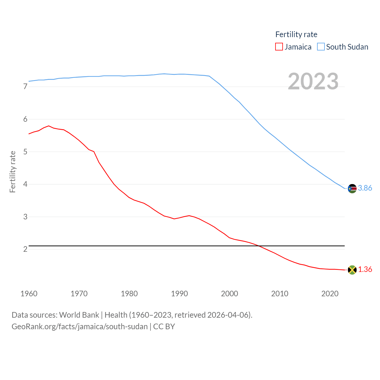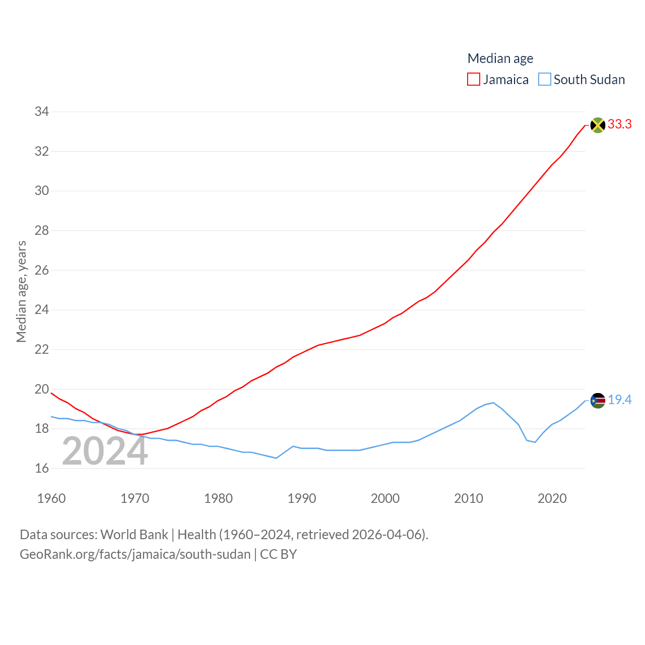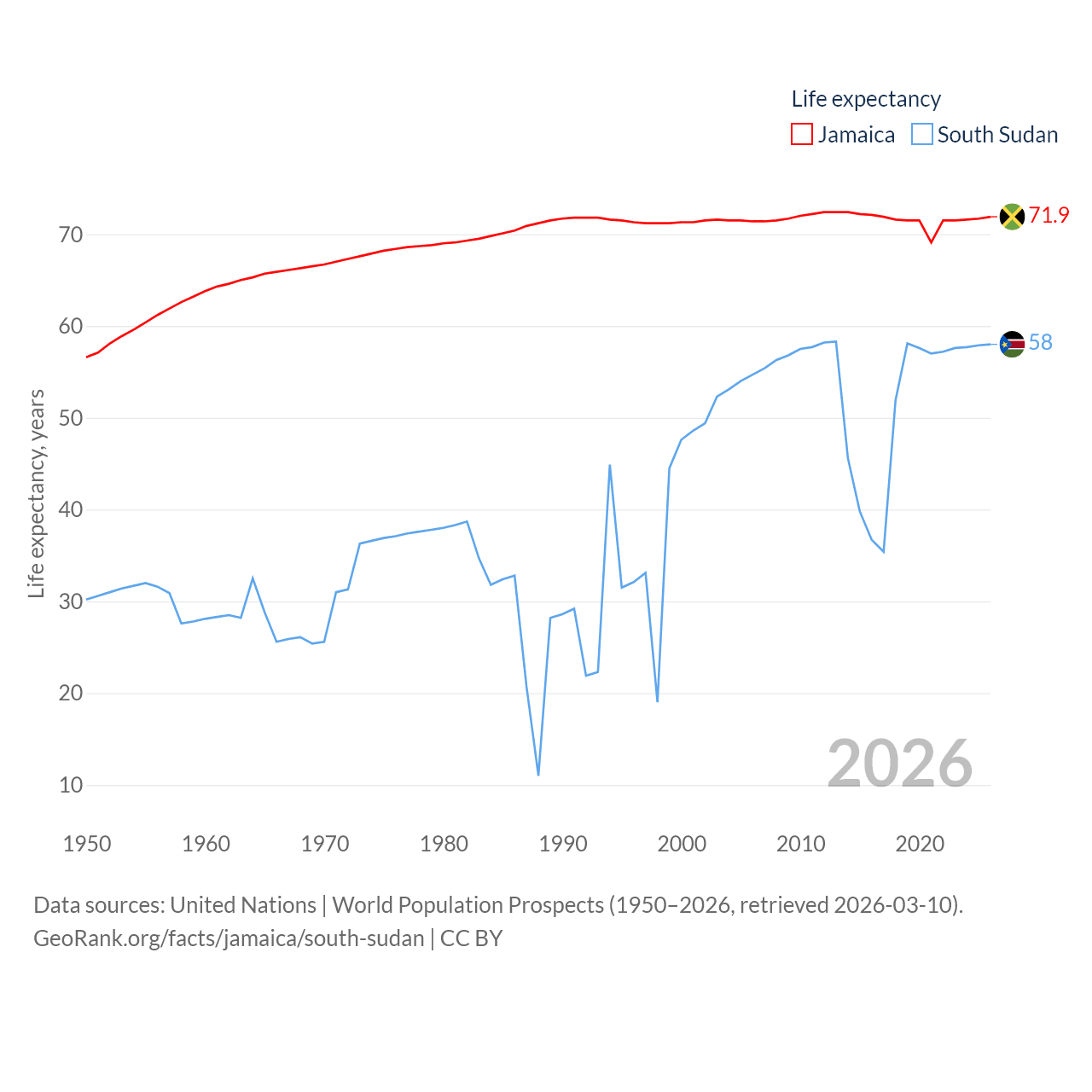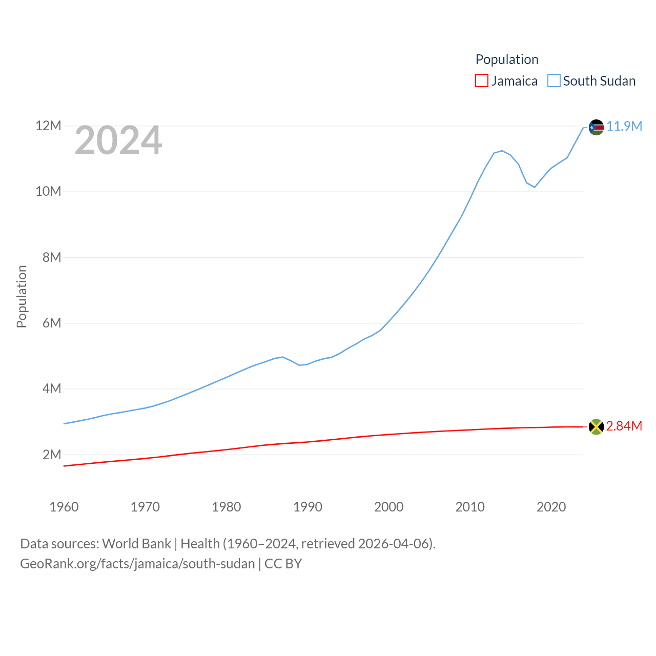 Jamaica has a population of 2.84M (ranked 139/197), compared with 11.9M in South Sudan (ranked 81/197). Jamaica's land area is 4,181 sq mi versus 243,990 sq mi for South Sudan (ranked 159th vs. 41st).