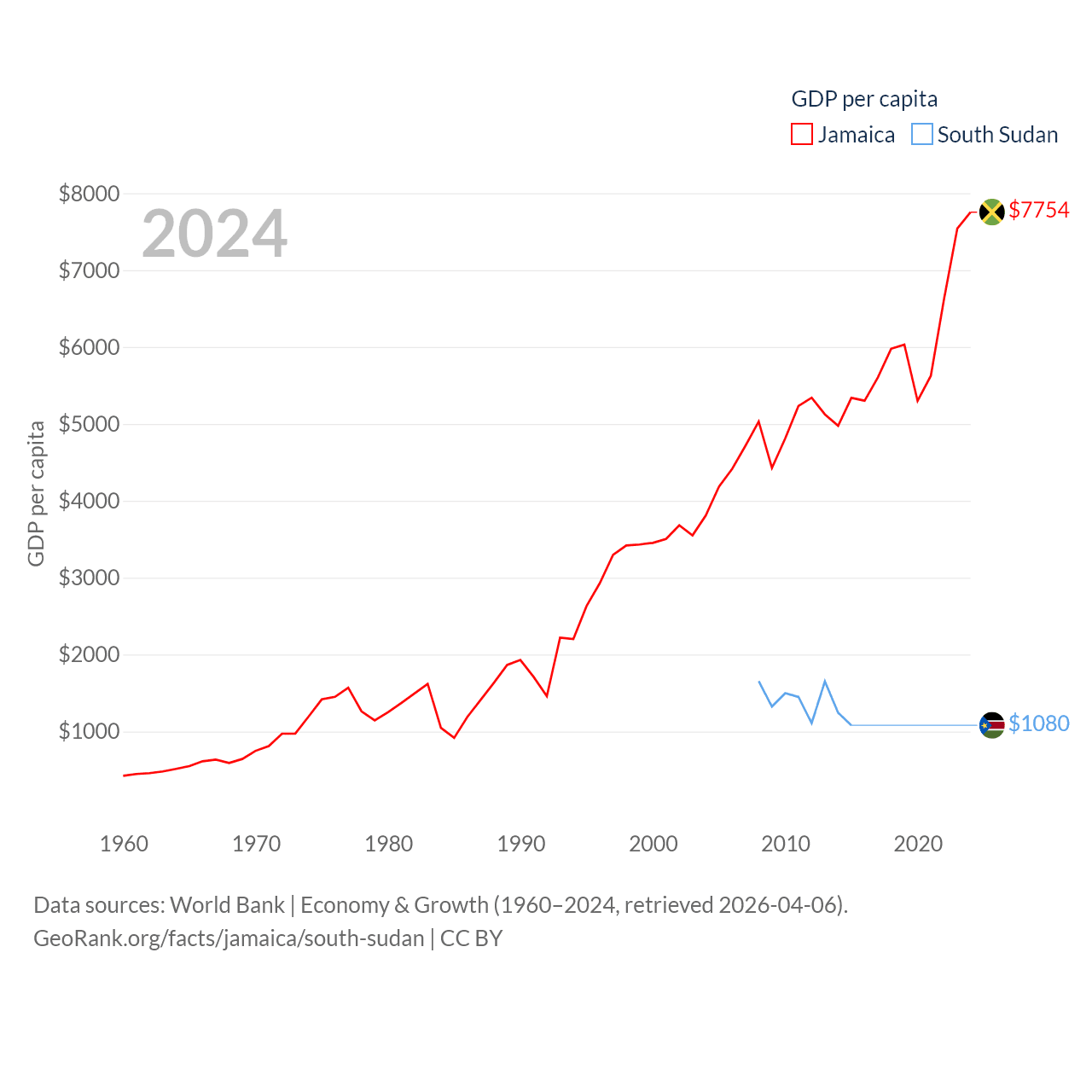 By GDP, Jamaica ranks 124/197 ($22B) and South Sudan ranks 149/197 ($12B). By GDP per capita, Jamaica ranks 95/197 ($7,754), while South Sudan ranks 175/197 ($1,080).