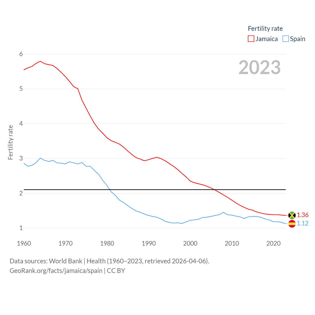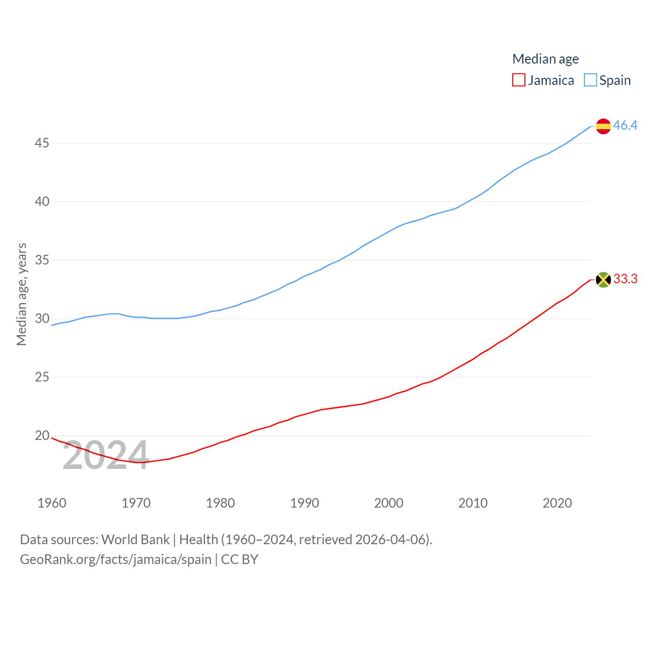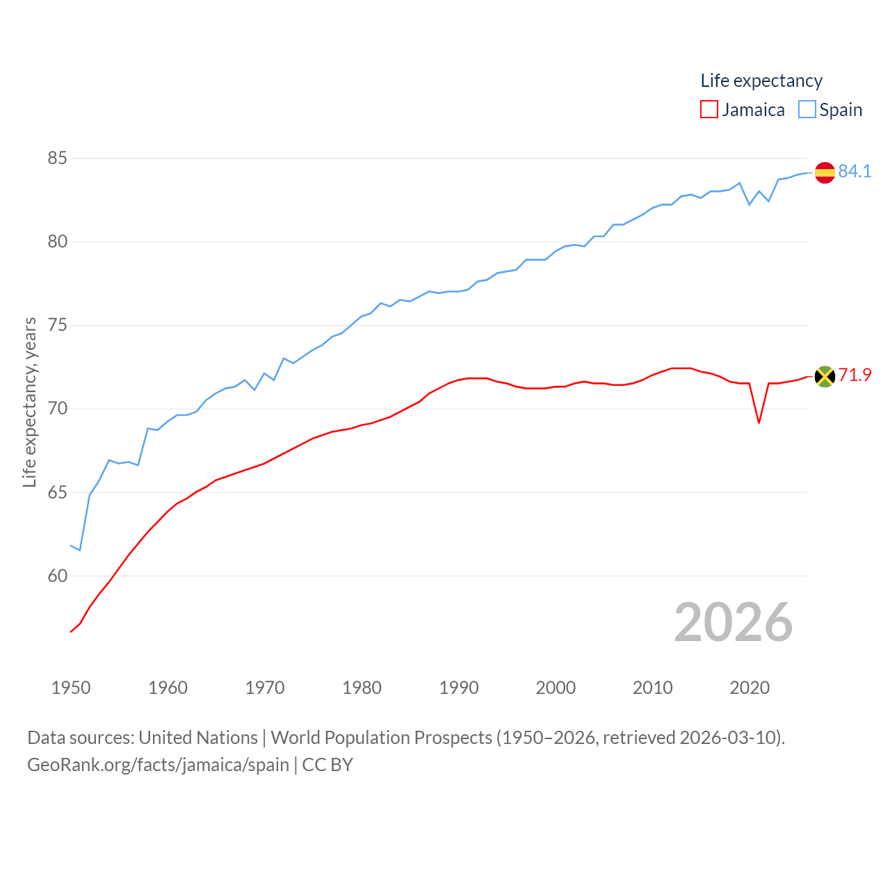 Jamaica has a population of 2.84M (ranked 139/197), compared with 48.8M in Spain (ranked 32/197). Jamaica's land area is 4,181 sq mi versus 192,934 sq mi for Spain (ranked 159th vs. 51st).