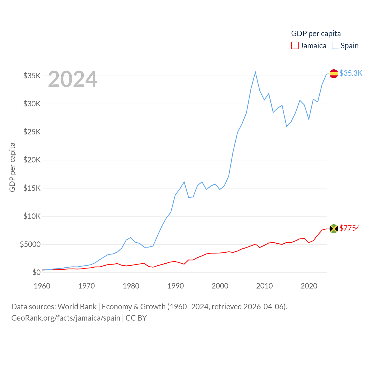 By GDP, Jamaica ranks 124/197 ($22B) and Spain ranks 15/197 ($1.73T). By GDP per capita, Jamaica ranks 95/197 ($7,754), while Spain ranks 32/197 ($35,327).