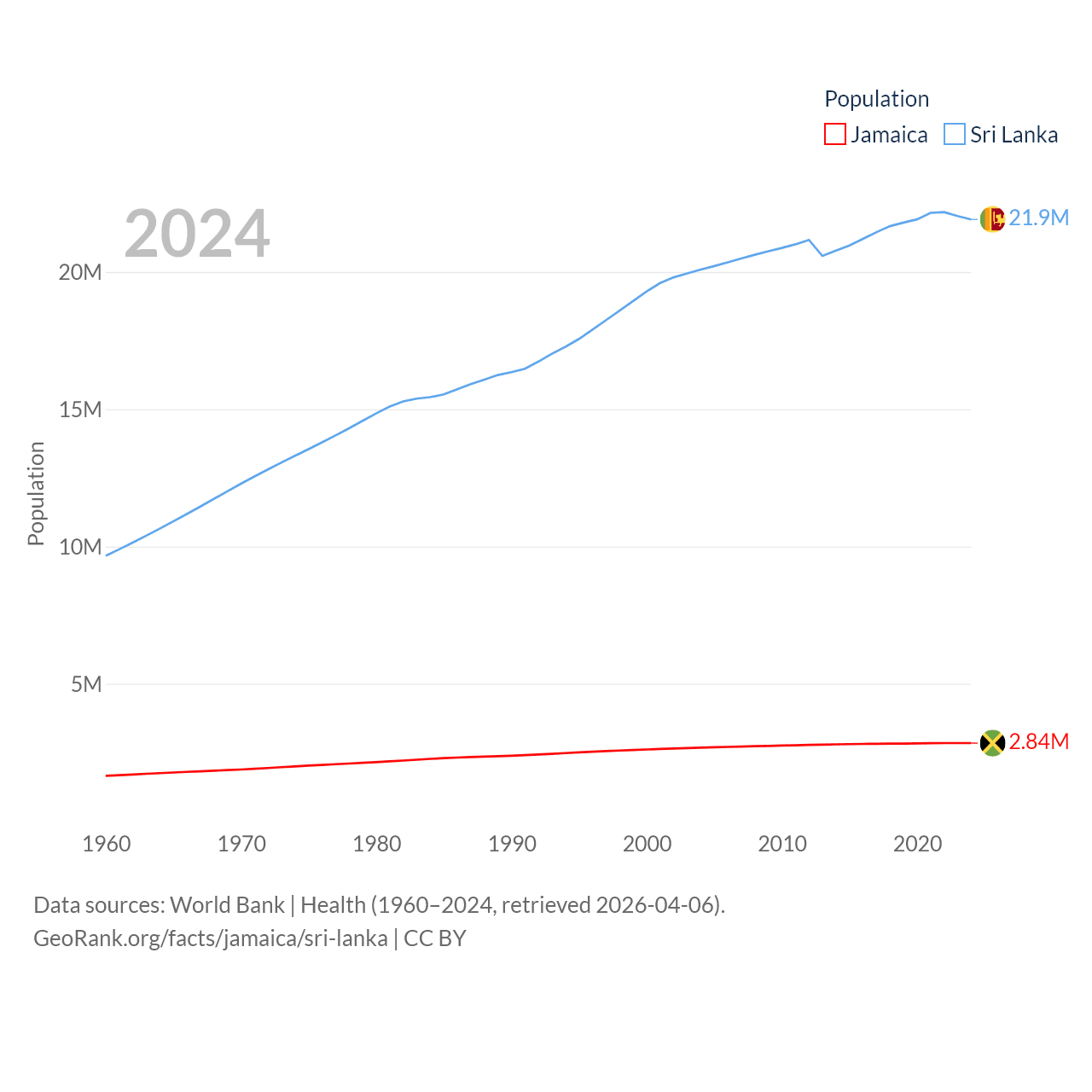 Jamaica has a population of 2.84M (ranked 139/197), compared with 21.9M in Sri Lanka (ranked 61/197). Jamaica's land area is 4,181 sq mi versus 23,884 sq mi for Sri Lanka (ranked 159th vs. 122nd).
