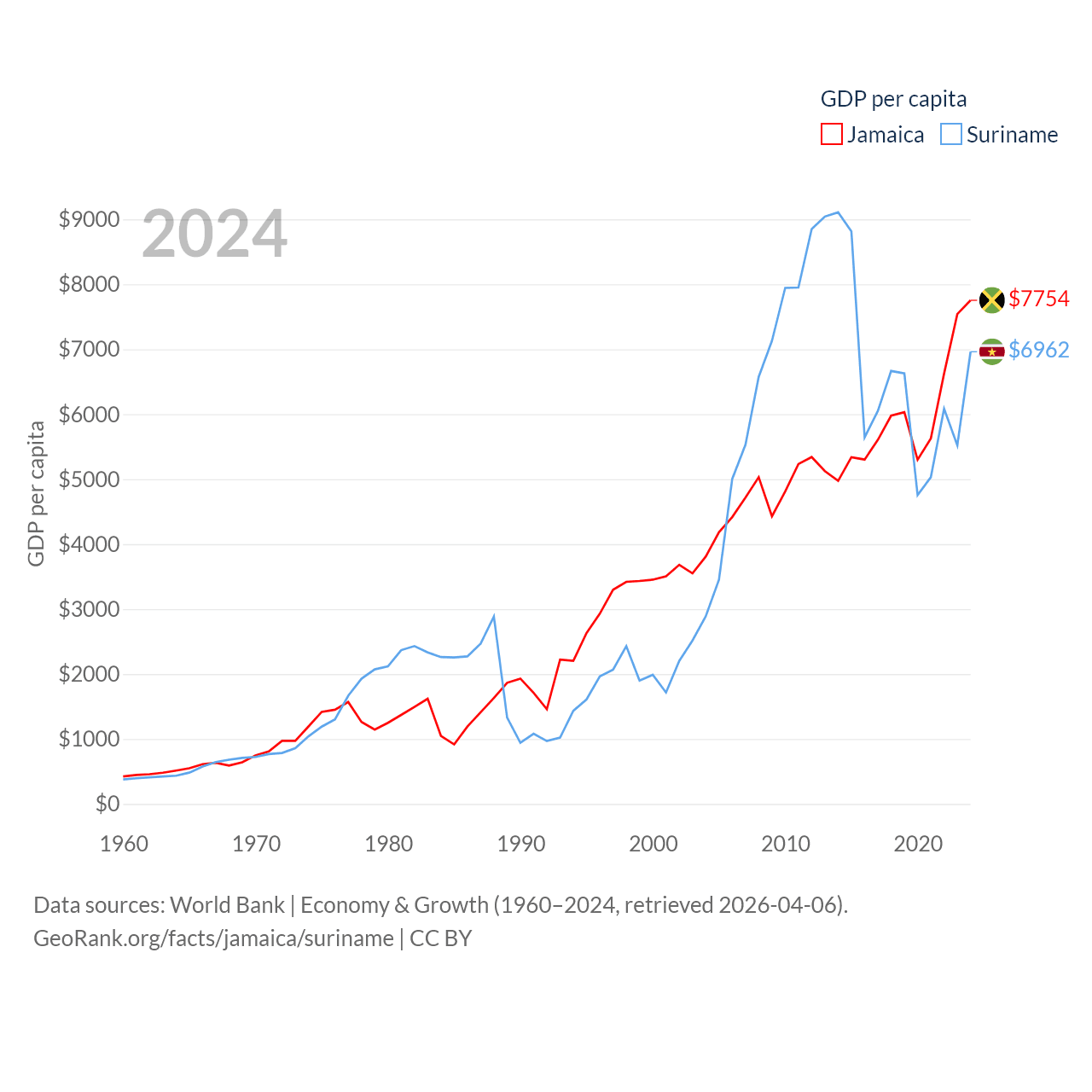 By GDP, Jamaica ranks 124/197 ($22B) and Suriname ranks 164/197 ($4.42B). By GDP per capita, Jamaica ranks 95/197 ($7,754), while Suriname ranks 102/197 ($6,962).