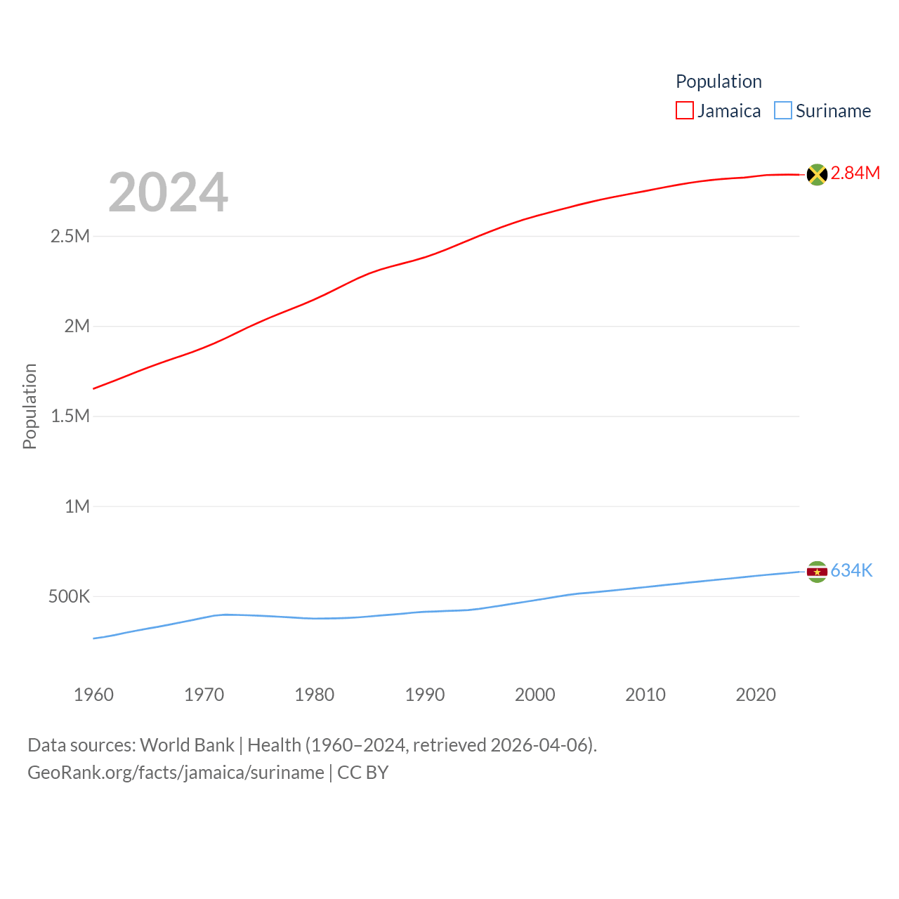 Jamaica has a population of 2.84M (ranked 139/197), compared with 634K in Suriname (ranked 165/197). Jamaica's land area is 4,181 sq mi versus 61,972 sq mi for Suriname (ranked 159th vs. 90th).