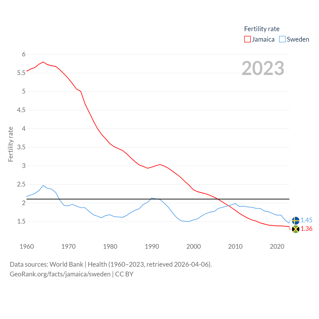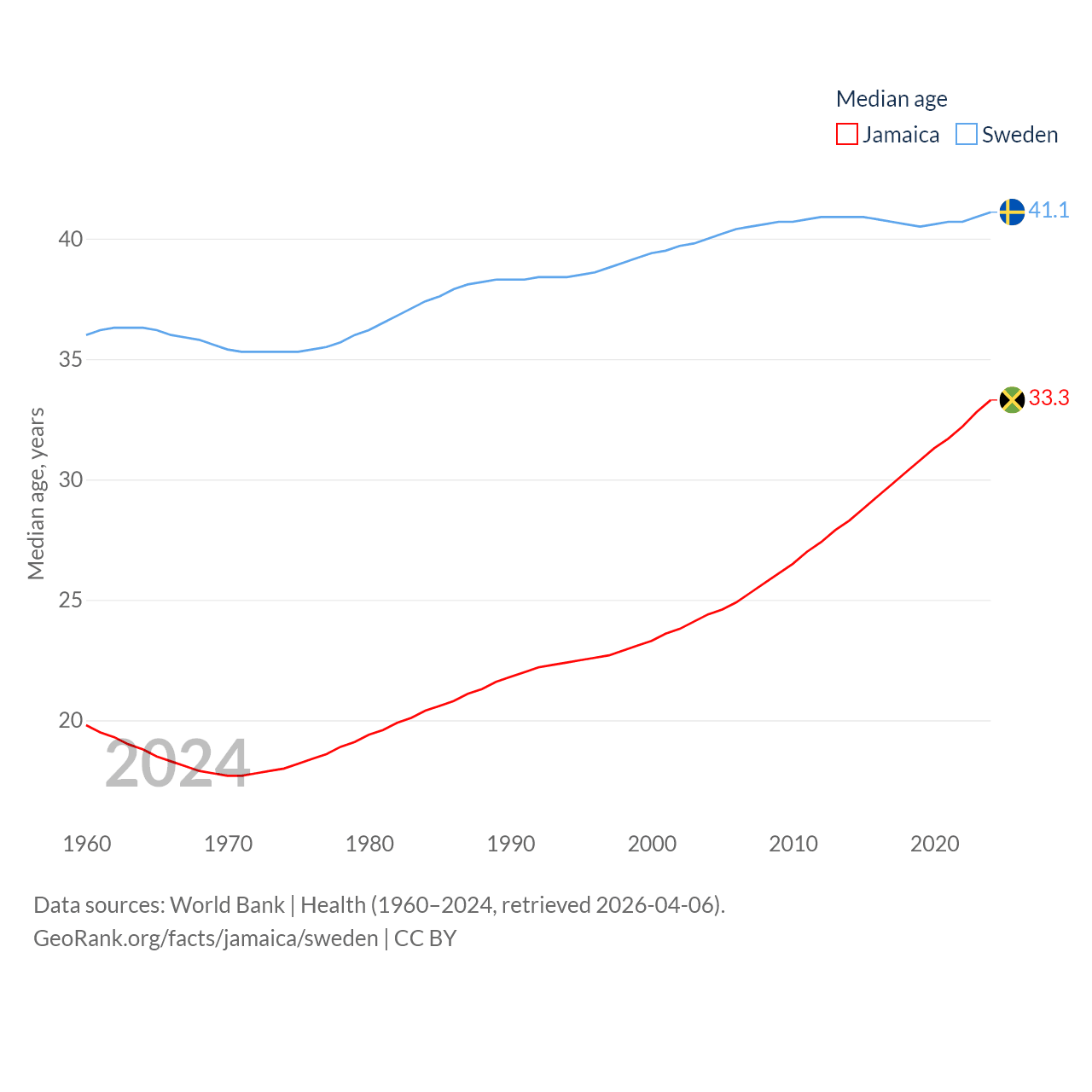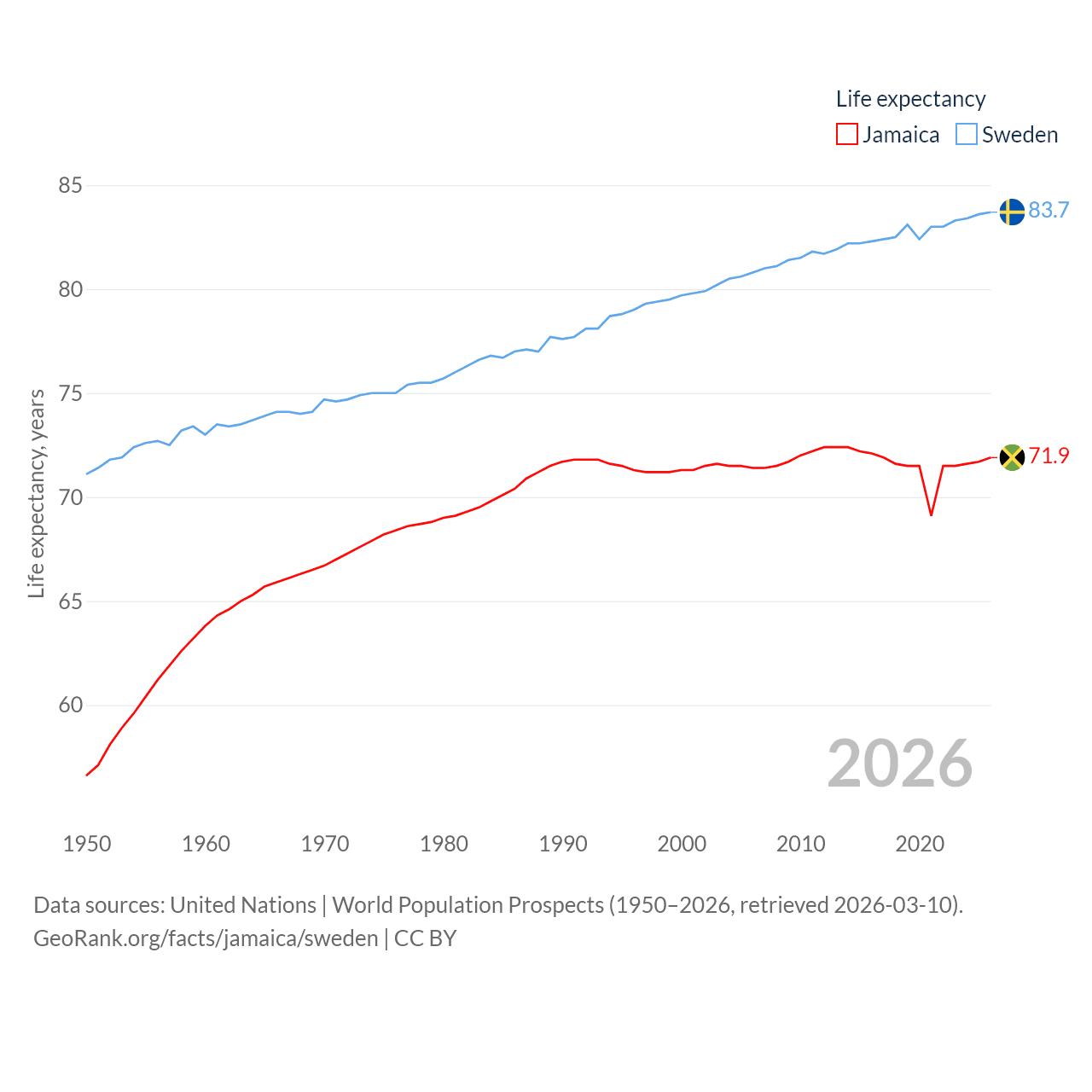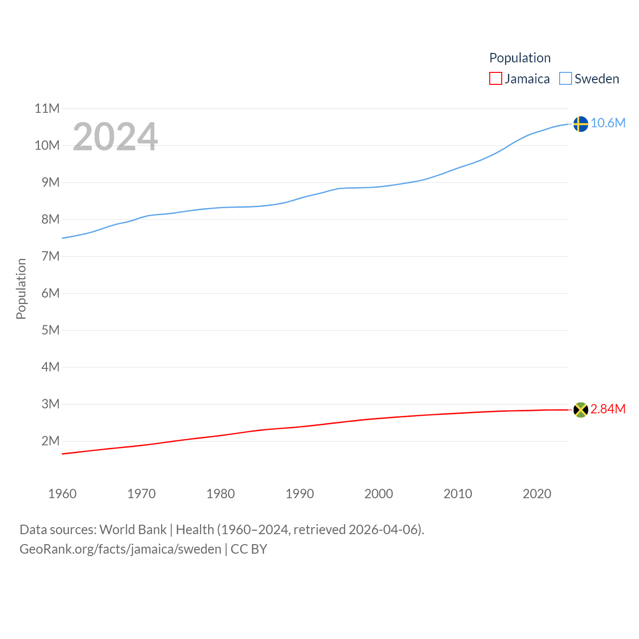 Jamaica has a population of 2.84M (ranked 139/197), compared with 10.6M in Sweden (ranked 93/197). Jamaica's land area is 4,181 sq mi versus 157,248 sq mi for Sweden (ranked 159th vs. 58th).
