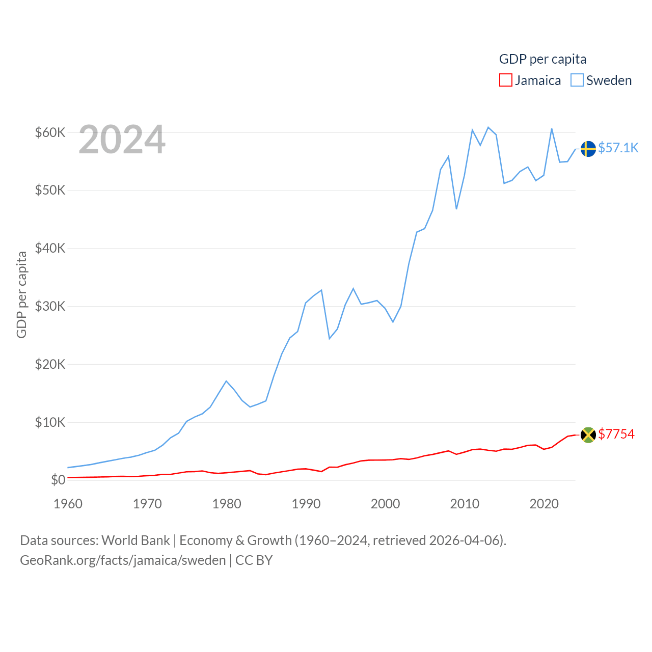 By GDP, Jamaica ranks 124/197 ($22B) and Sweden ranks 26/197 ($604B). By GDP per capita, Jamaica ranks 95/197 ($7,754), while Sweden ranks 17/197 ($57,117).