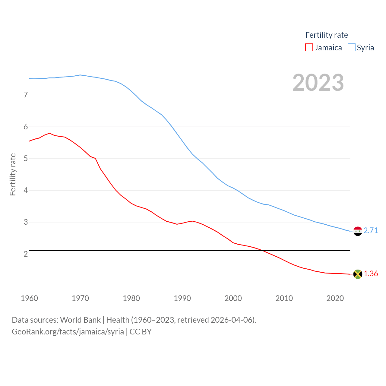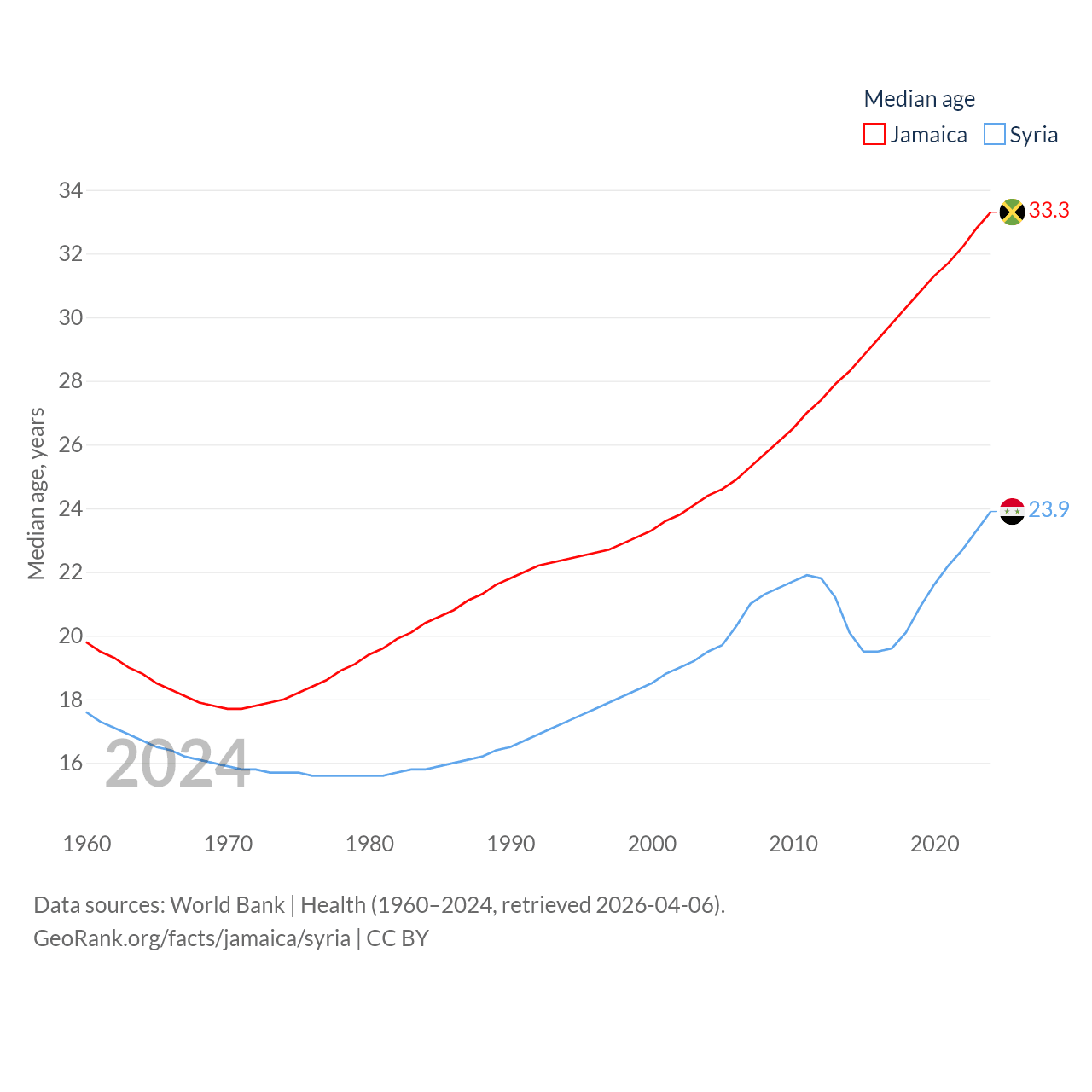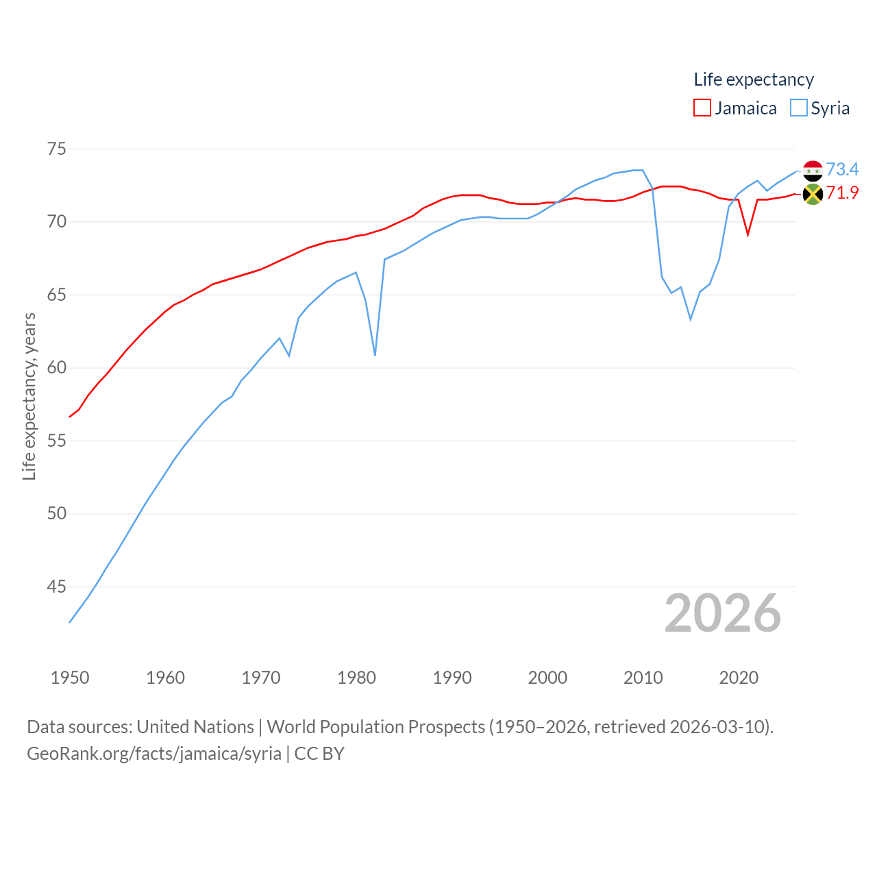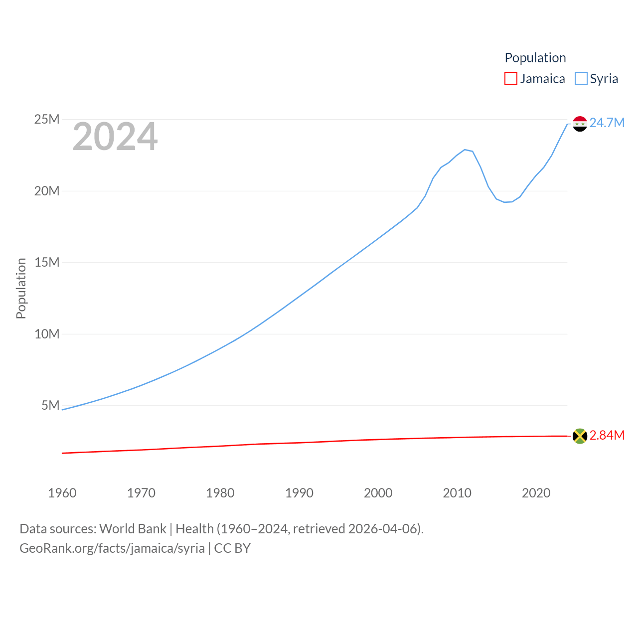 Jamaica has a population of 2.84M (ranked 139/197), compared with 24.7M in Syria (ranked 57/197). Jamaica's land area is 4,181 sq mi versus 70,900 sq mi for Syria (ranked 159th vs. 87th).
