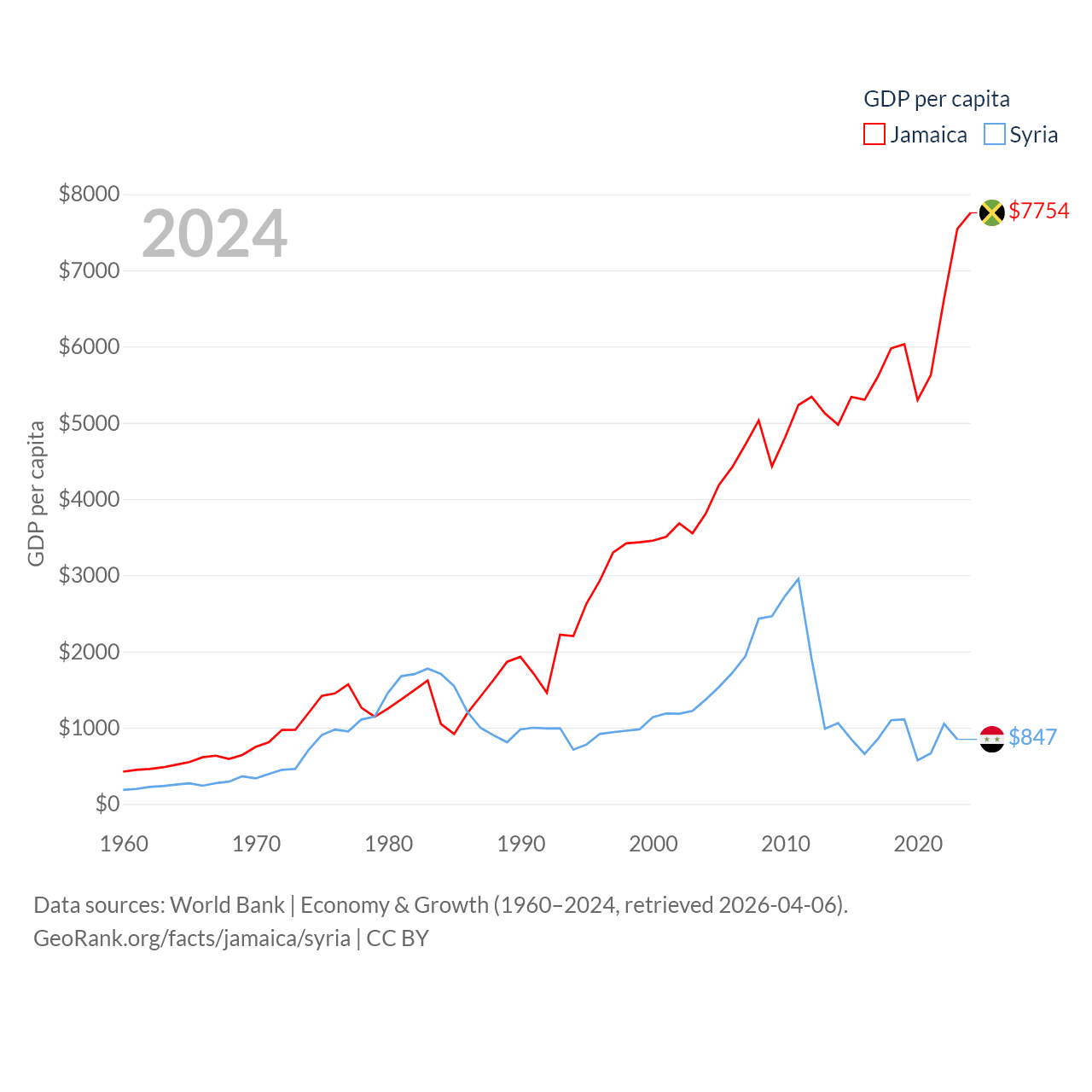 By GDP, Jamaica ranks 124/197 ($22B) and Syria ranks 129/197 ($20B). By GDP per capita, Jamaica ranks 95/197 ($7,754), while Syria ranks 185/197 ($847).