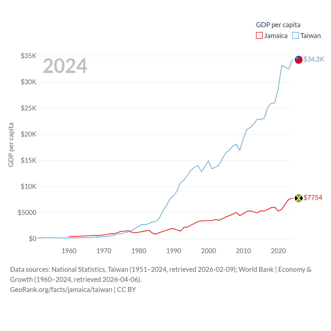 By GDP, Jamaica ranks 124/197 ($22B) and Taiwan ranks 22/197 ($802B). By GDP per capita, Jamaica ranks 95/197 ($7,754), while Taiwan ranks 35/197 ($34,238).