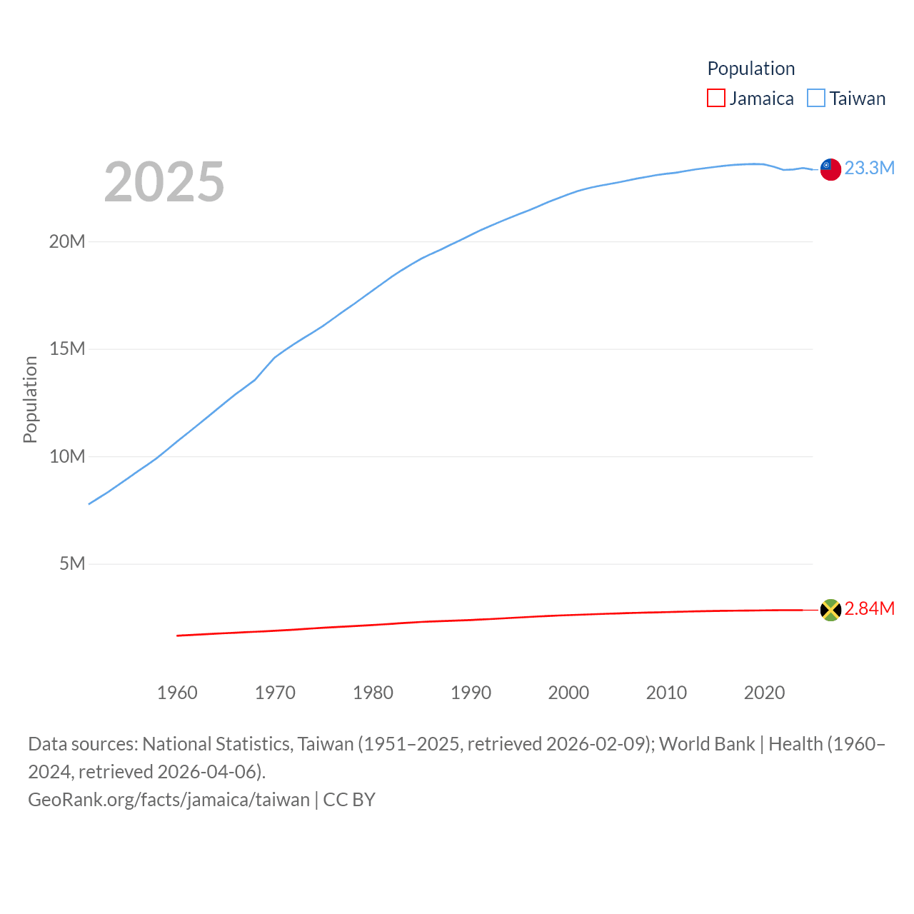 Jamaica has a population of 2.84M (ranked 139/197), compared with 23.3M in Taiwan (ranked 60/197). Jamaica's land area is 4,181 sq mi versus 13,976 sq mi for Taiwan (ranked 159th vs. 133rd).