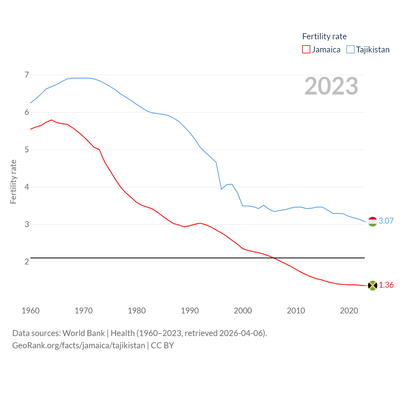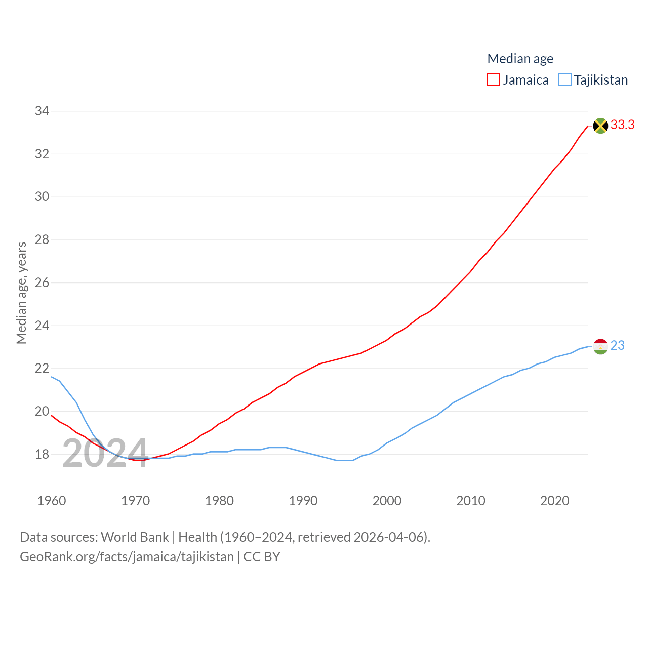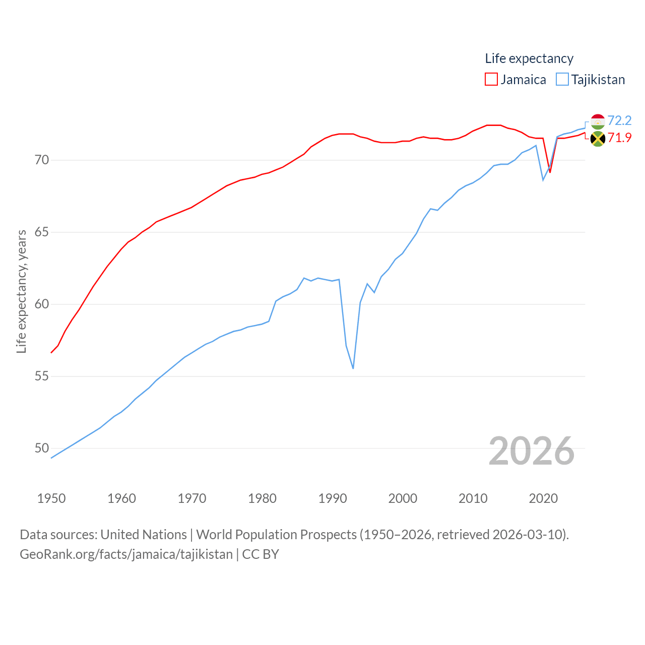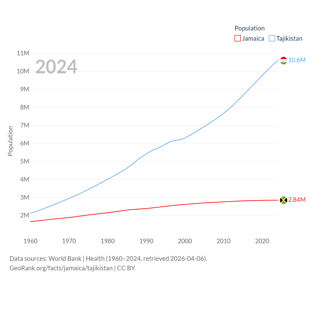 Jamaica has a population of 2.84M (ranked 139/197), compared with 10.6M in Tajikistan (ranked 91/197). Jamaica's land area is 4,181 sq mi versus 53,587 sq mi for Tajikistan (ranked 159th vs. 93rd).