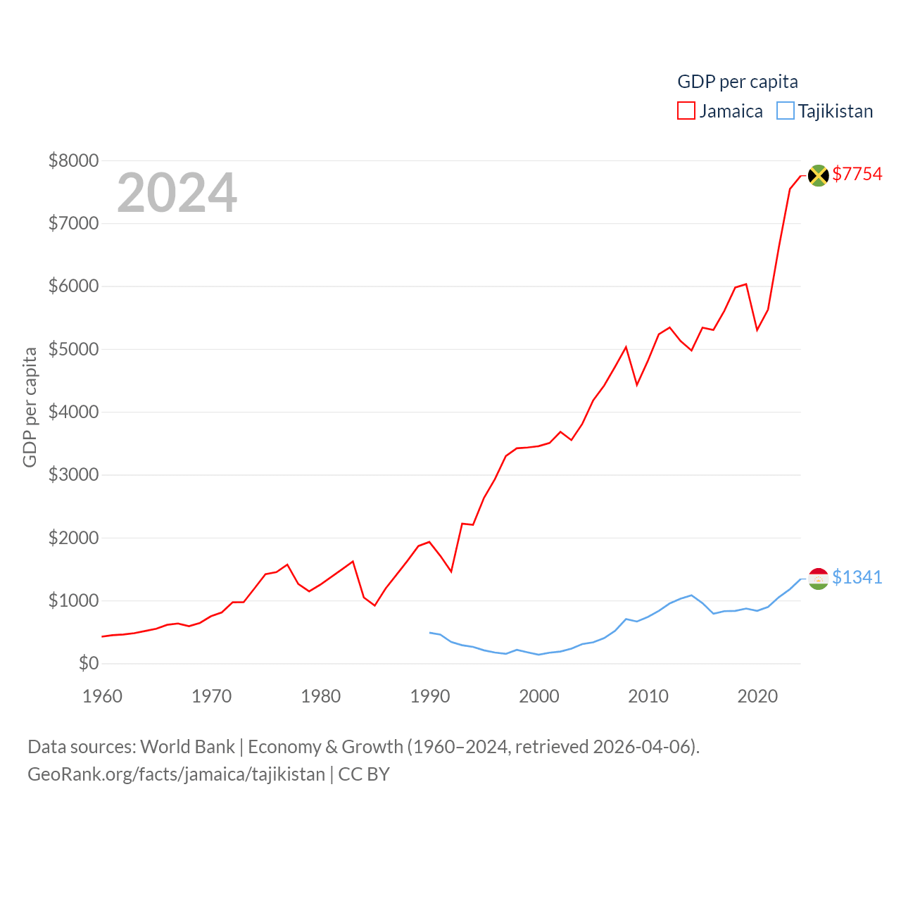 By GDP, Jamaica ranks 124/197 ($22B) and Tajikistan ranks 145/197 ($14.2B). By GDP per capita, Jamaica ranks 95/197 ($7,754), while Tajikistan ranks 166/197 ($1,341).