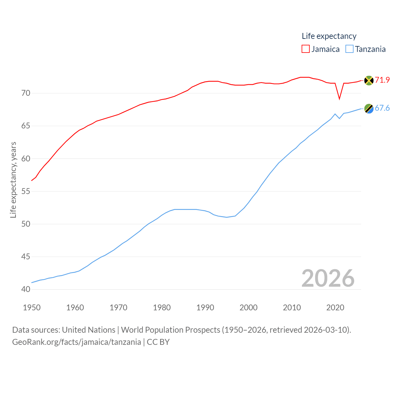 Jamaica has a population of 2.84M (ranked 139/197), compared with 68.6M in Tanzania (ranked 22/197). Jamaica's land area is 4,181 sq mi versus 342,009 sq mi for Tanzania (ranked 159th vs. 31st).