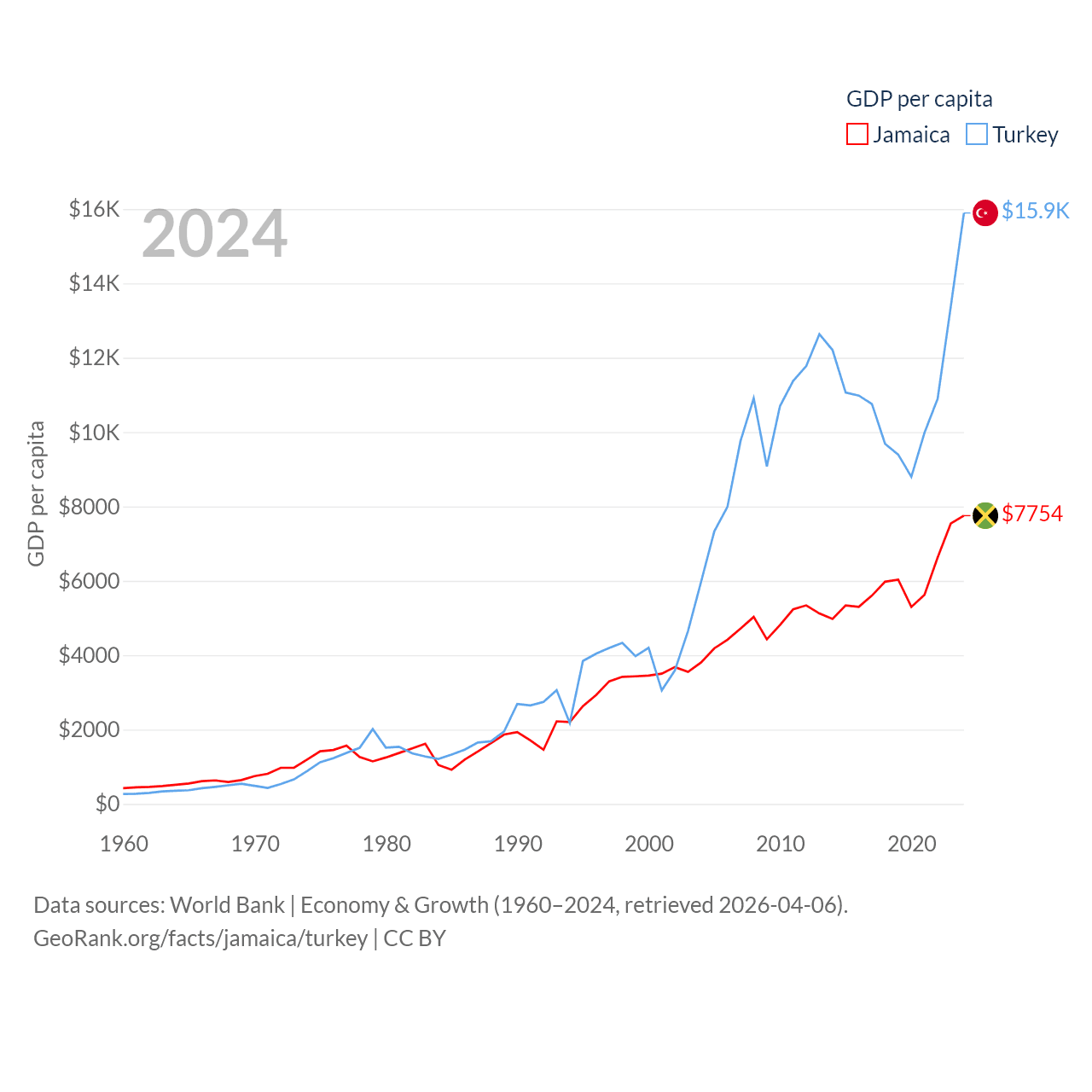 By GDP, Jamaica ranks 124/197 ($22B) and Turkey ranks 17/197 ($1.36T). By GDP per capita, Jamaica ranks 95/197 ($7,754), while Turkey ranks 66/197 ($15,893).
