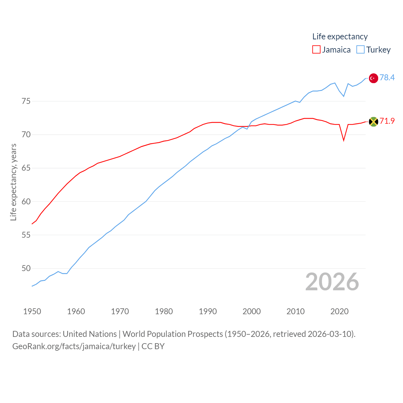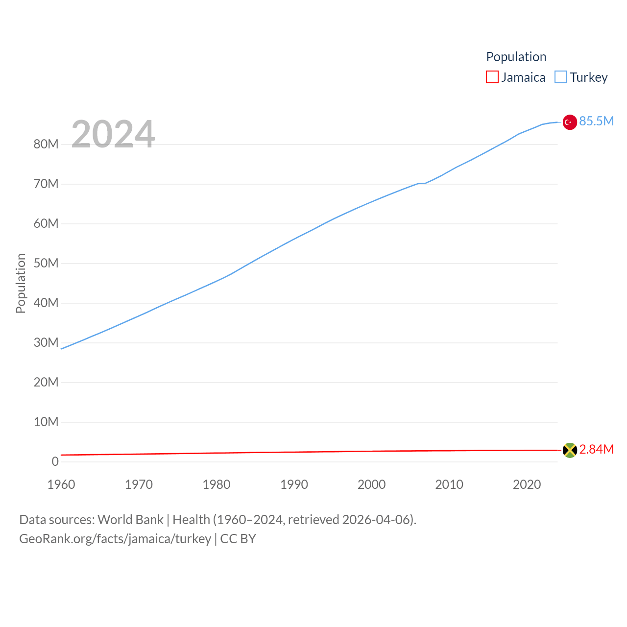 Jamaica has a population of 2.84M (ranked 139/197), compared with 85.5M in Turkey (ranked 18/197). Jamaica's land area is 4,181 sq mi versus 297,156 sq mi for Turkey (ranked 159th vs. 36th).