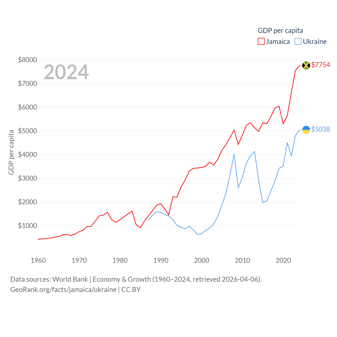 By GDP, Jamaica ranks 124/197 ($22B) and Ukraine ranks 57/197 ($191B). By GDP per capita, Jamaica ranks 95/197 ($7,754), while Ukraine ranks 120/197 ($5,038).