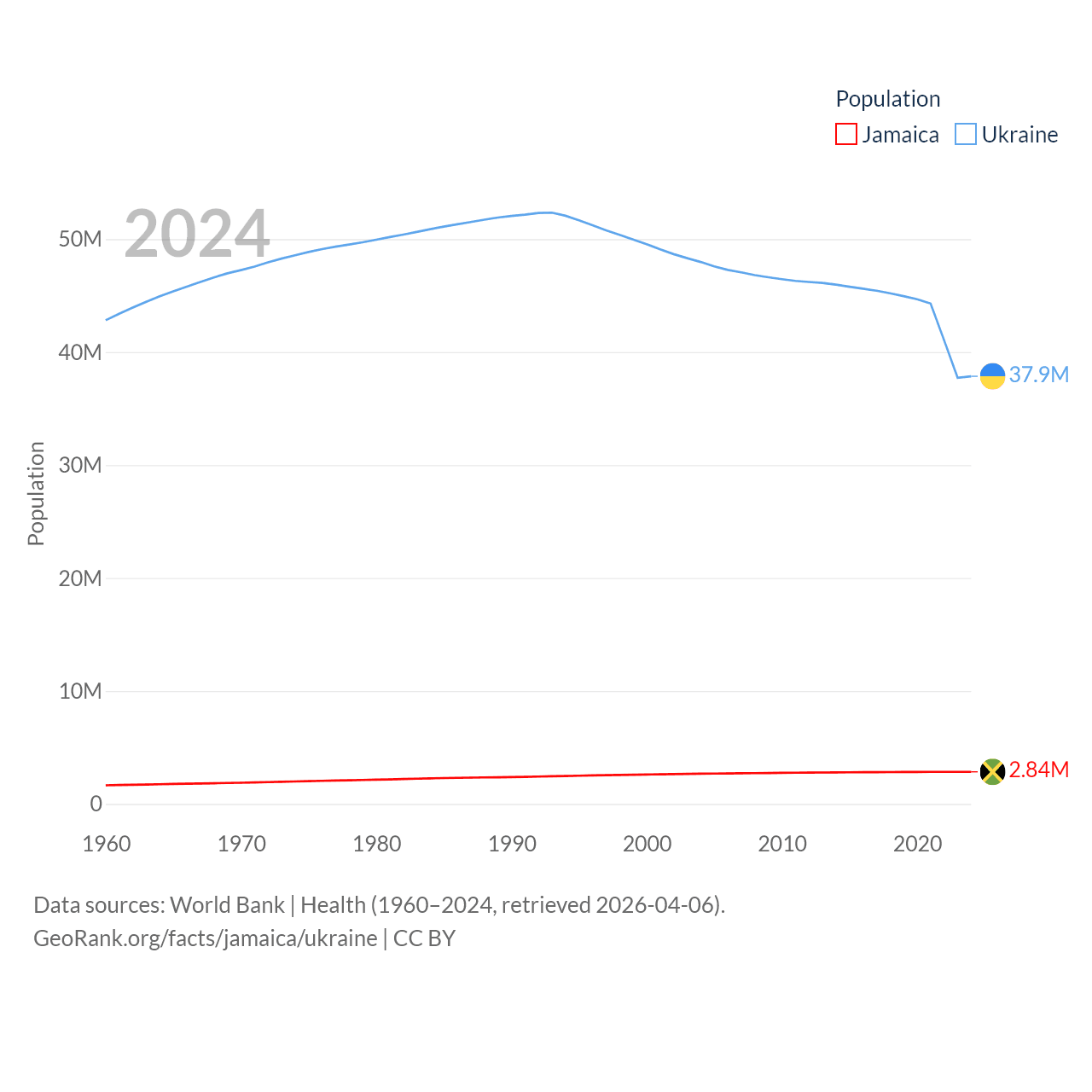 Jamaica has a population of 2.84M (ranked 139/197), compared with 37.9M in Ukraine (ranked 41/197). Jamaica's land area is 4,181 sq mi versus 223,708 sq mi for Ukraine (ranked 159th vs. 46th).
