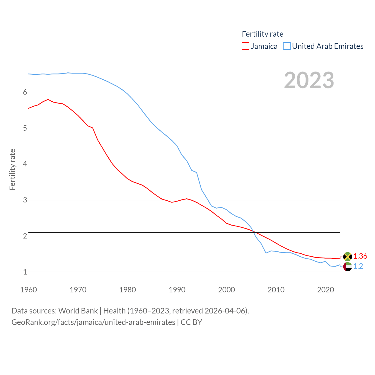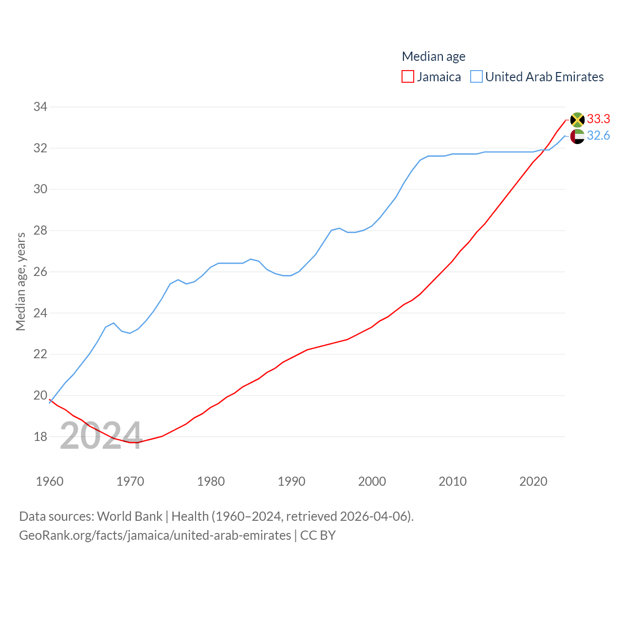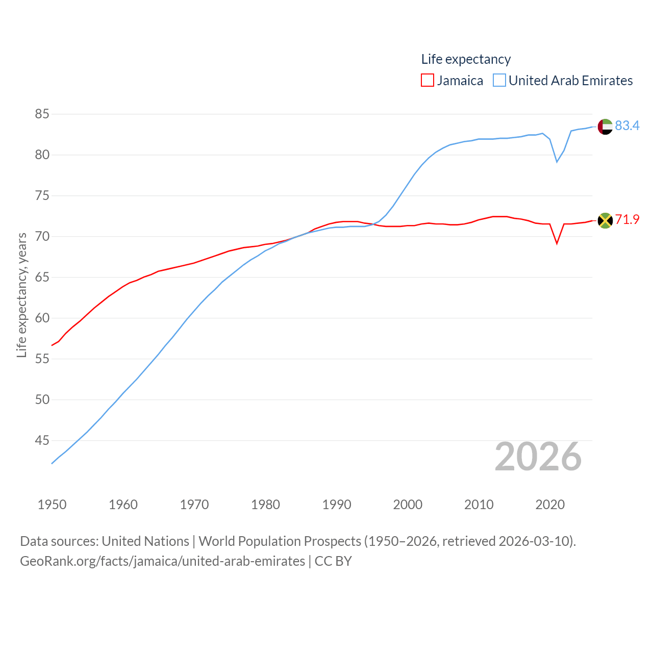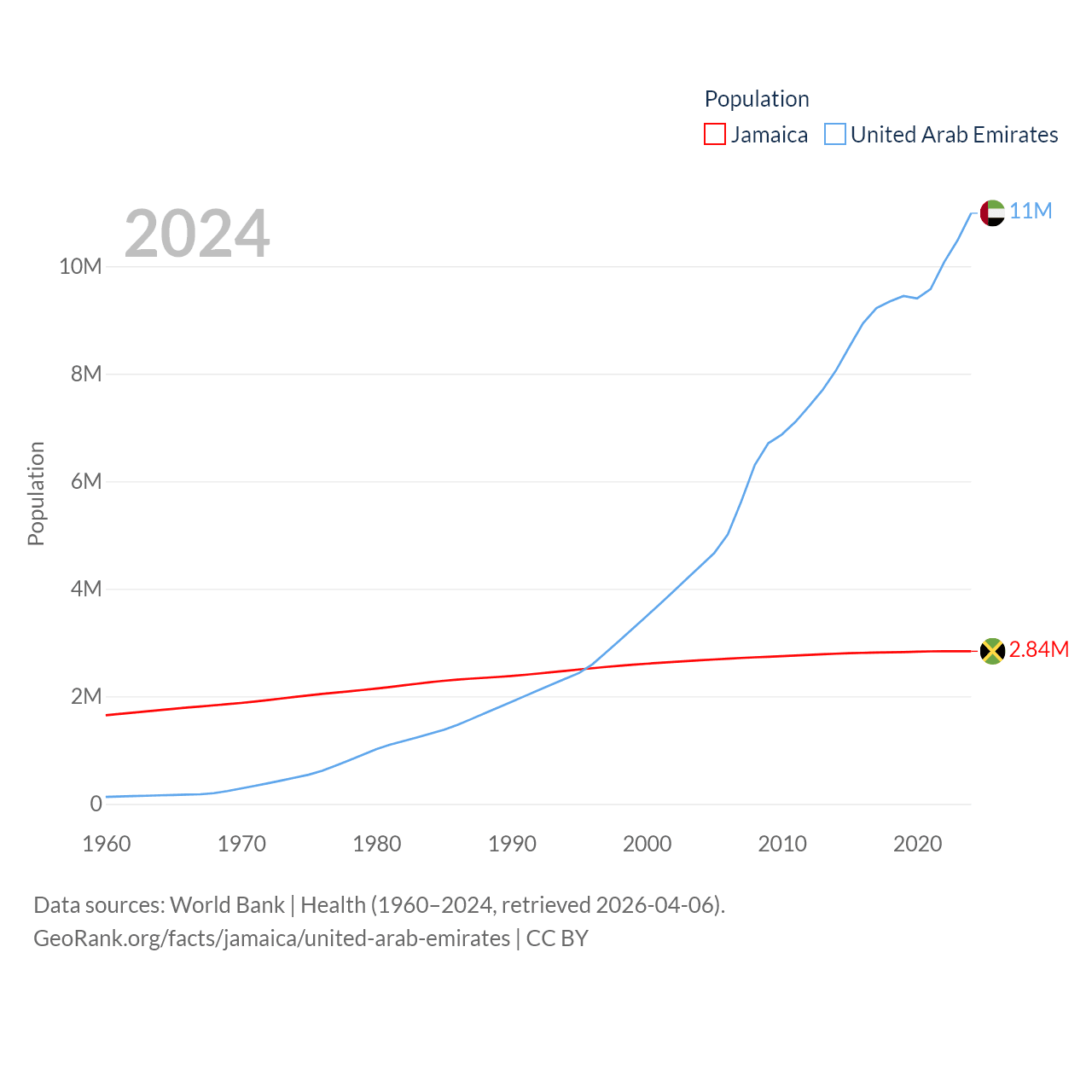 Jamaica has a population of 2.84M (ranked 139/197), compared with 11M in The United Arab Emirates (ranked 86/197). Jamaica's land area is 4,181 sq mi versus 27,421 sq mi for The United Arab Emirates (ranked 159th vs. 117th).
