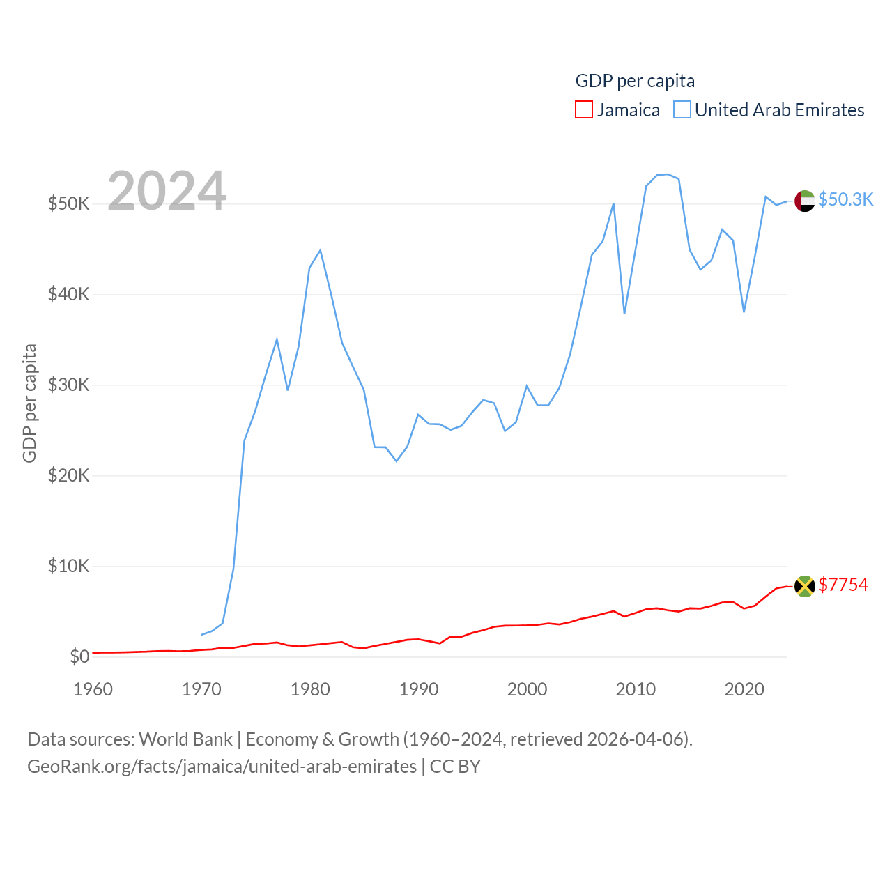 By GDP, Jamaica ranks 124/197 ($22B) and The United Arab Emirates ranks 27/197 ($552B). By GDP per capita, Jamaica ranks 95/197 ($7,754), while The United Arab Emirates ranks 24/197 ($50,274).
