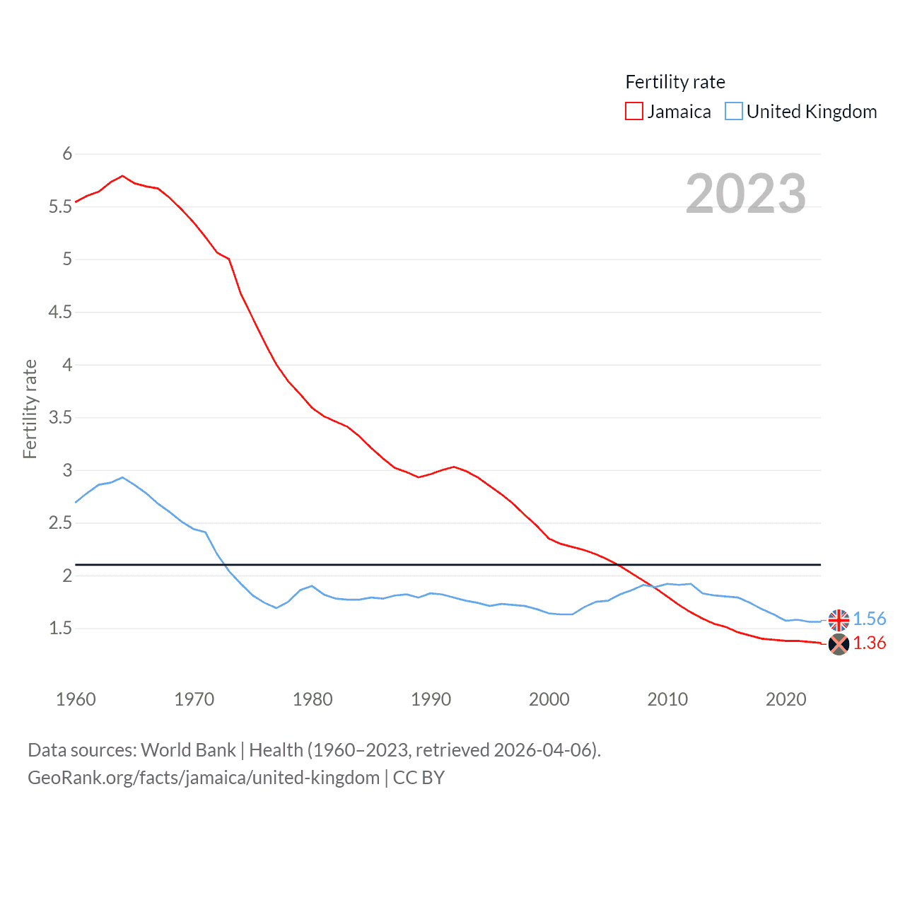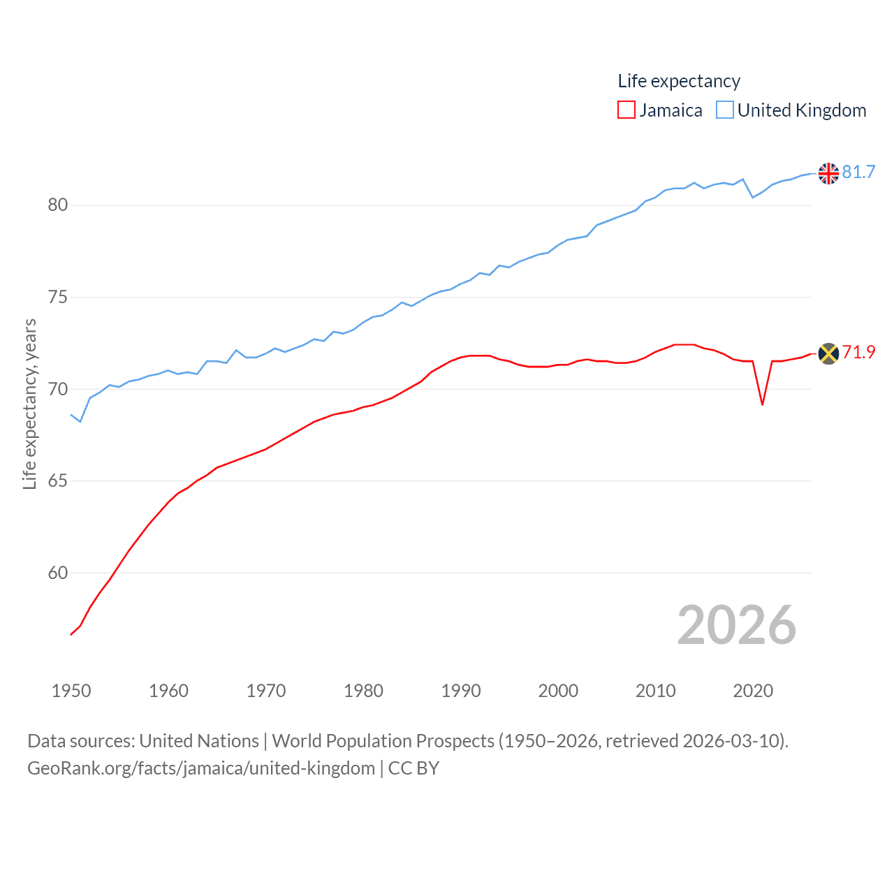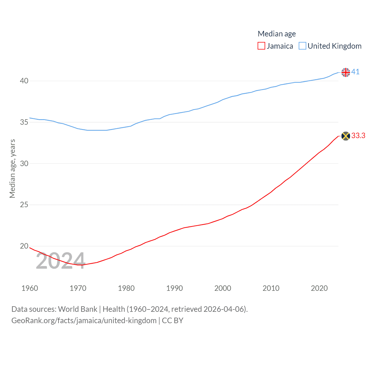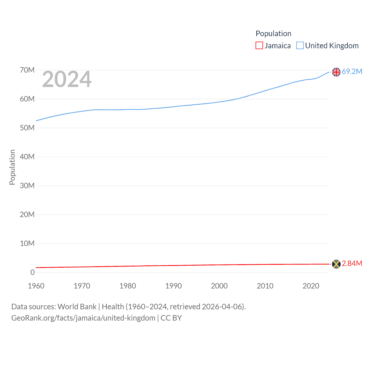 Jamaica has a population of 2.84M (ranked 139/197), compared with 69.2M in The United Kingdom (ranked 21/197). Jamaica's land area is 4,181 sq mi versus 93,410 sq mi for The United Kingdom (ranked 159th vs. 78th).