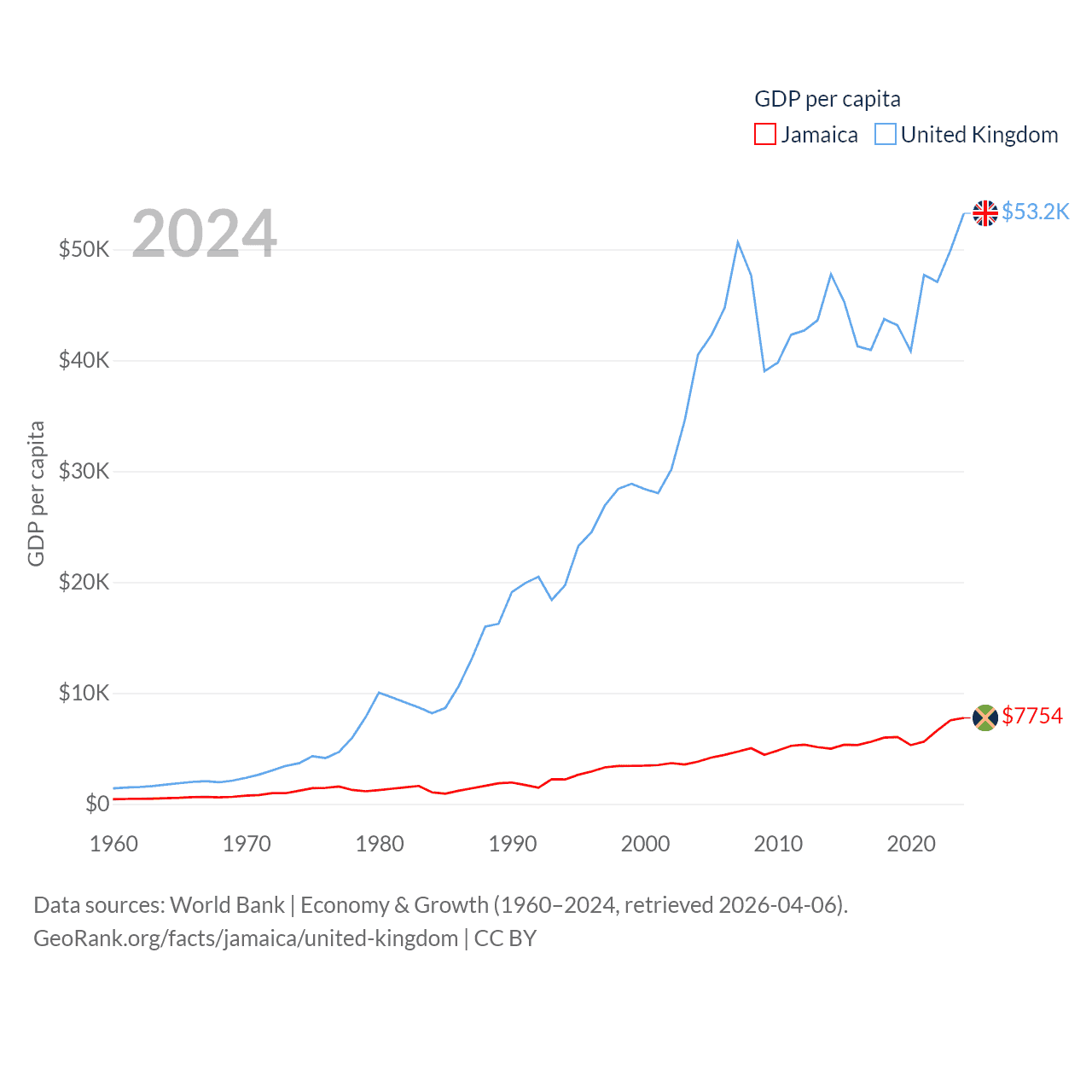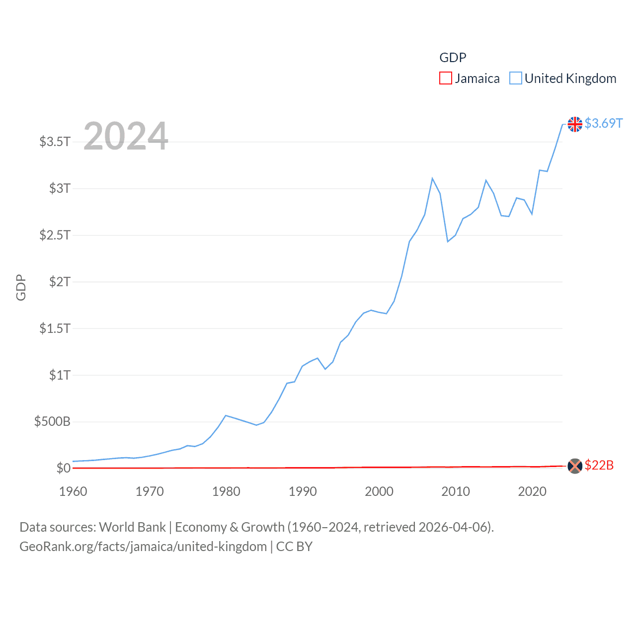 By GDP, Jamaica ranks 124/197 ($22B) and The United Kingdom ranks 6/197 ($3.69T). By GDP per capita, Jamaica ranks 95/197 ($7,754), while The United Kingdom ranks 22/197 ($53,246).
