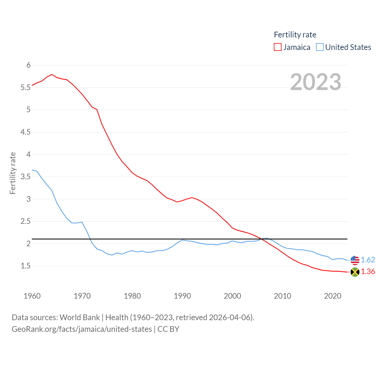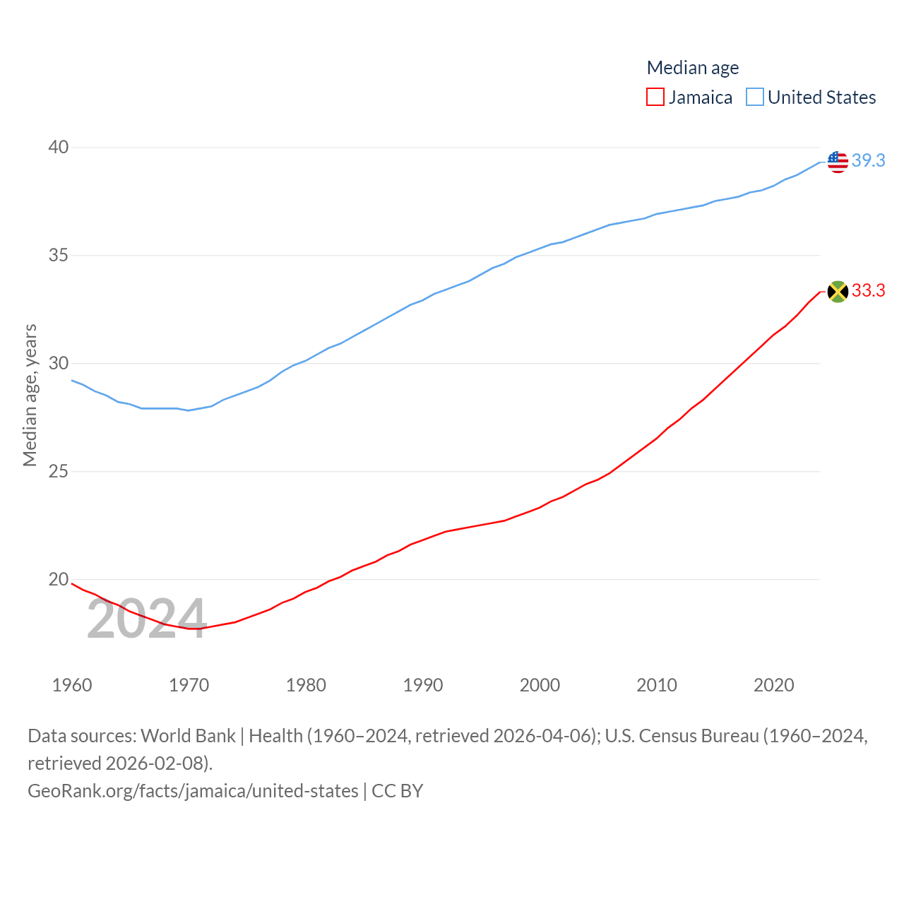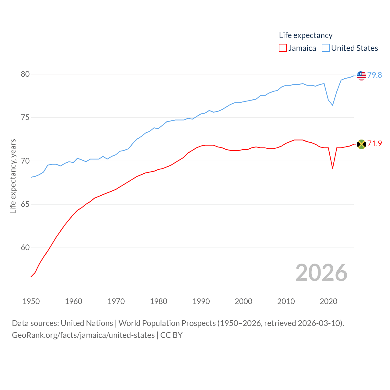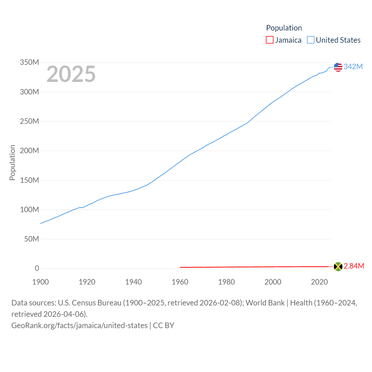Jamaica has a population of 2.84M (ranked 139/197), compared with 342M in The United States (ranked 3/197). Jamaica's land area is 4,181 sq mi versus 3,531,839 sq mi for The United States (ranked 159th vs. 3rd).
