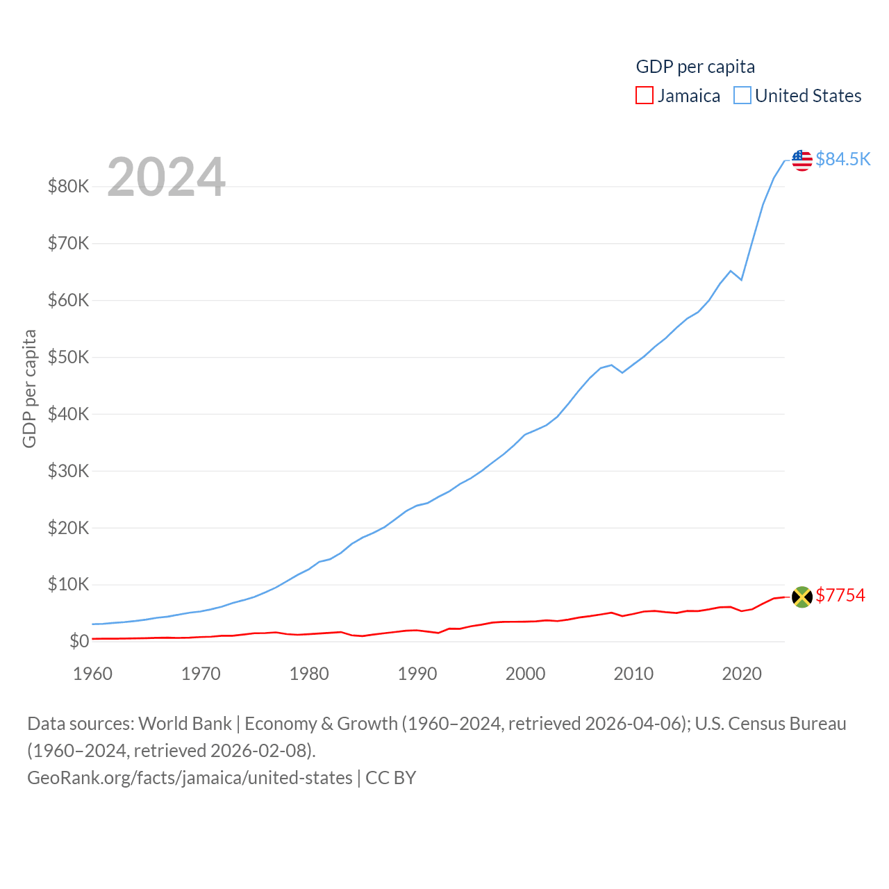 By GDP, Jamaica ranks 124/197 ($22B) and The United States ranks 1/197 ($28.8T). By GDP per capita, Jamaica ranks 95/197 ($7,754), while The United States ranks 10/197 ($84,534).