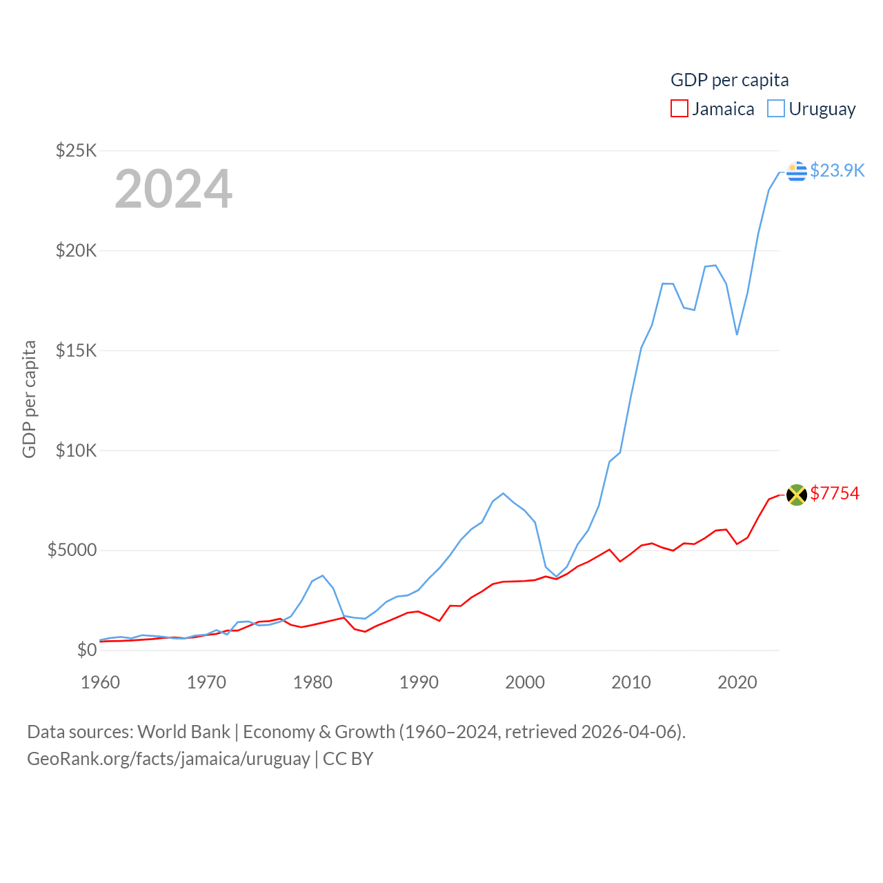 By GDP, Jamaica ranks 124/197 ($22B) and Uruguay ranks 81/197 ($81B). By GDP per capita, Jamaica ranks 95/197 ($7,754), while Uruguay ranks 52/197 ($23,907).