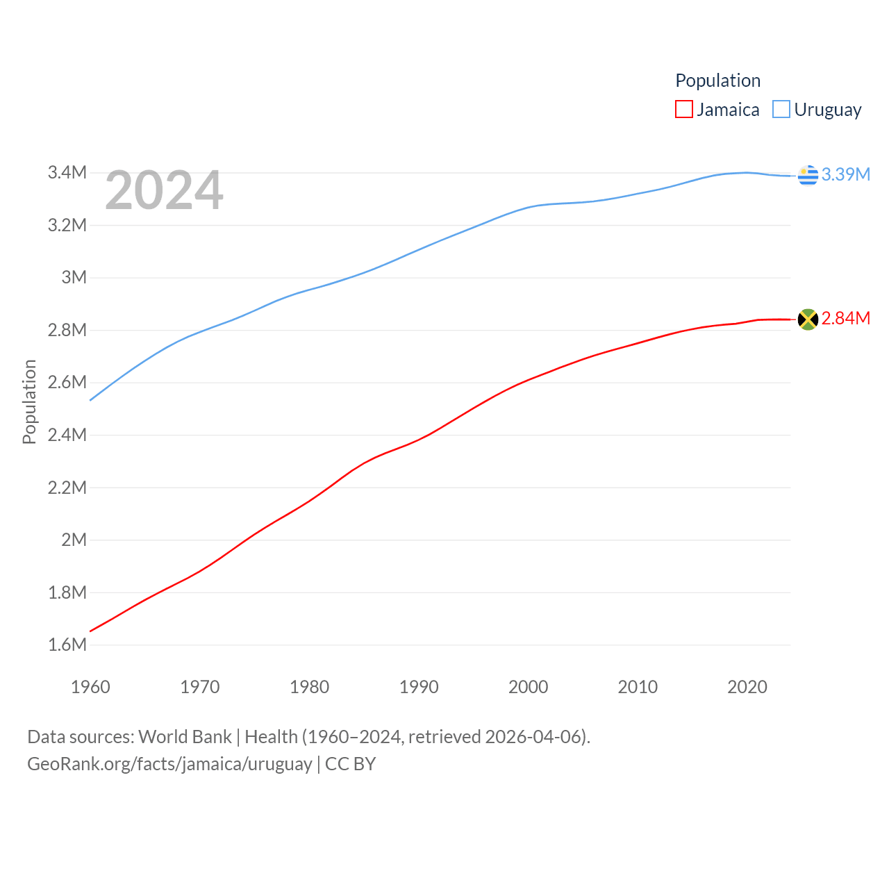 Jamaica has a population of 2.84M (ranked 139/197), compared with 3.39M in Uruguay (ranked 133/197). Jamaica's land area is 4,181 sq mi versus 67,576 sq mi for Uruguay (ranked 159th vs. 89th).