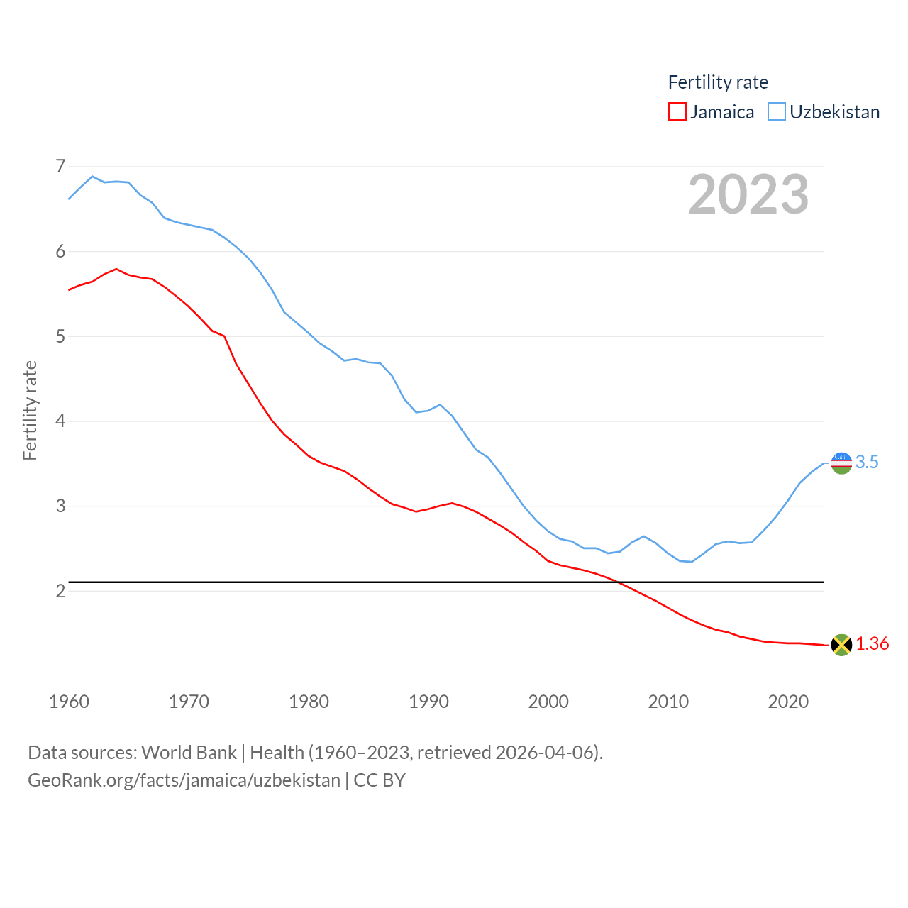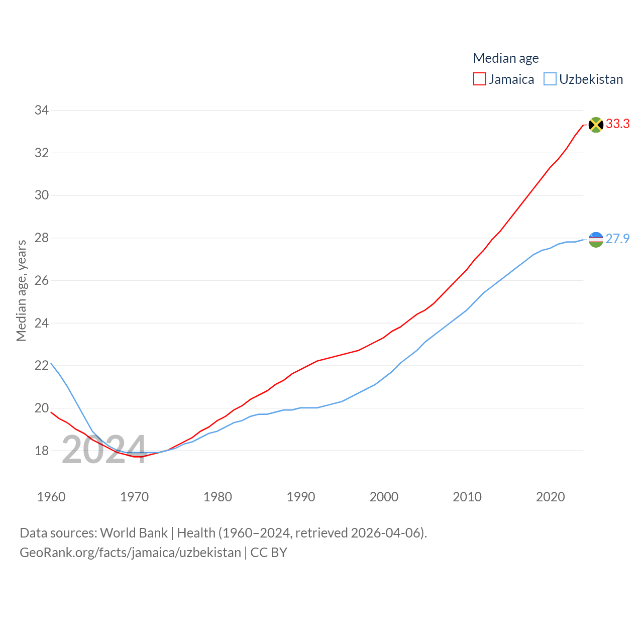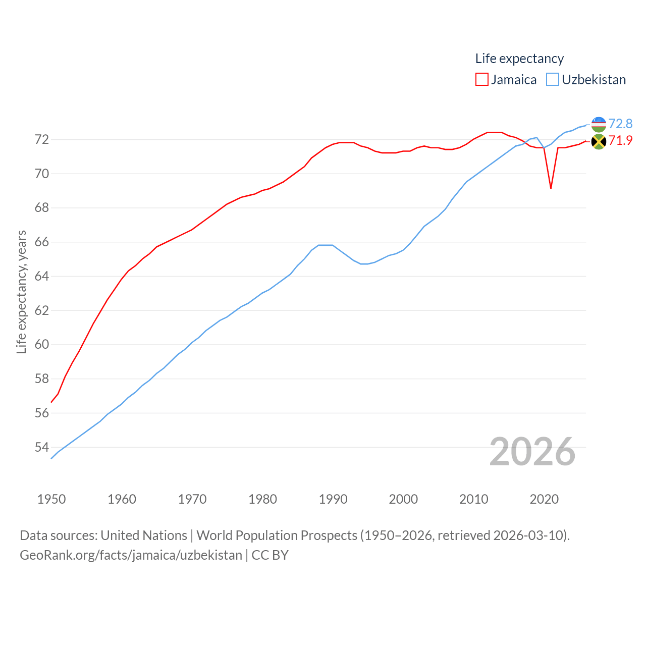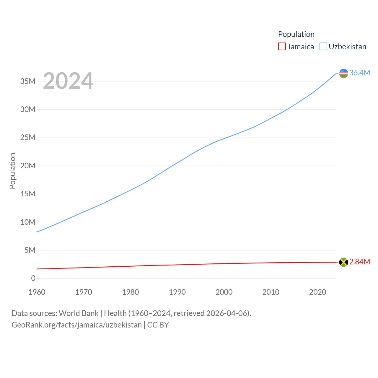 Jamaica has a population of 2.84M (ranked 139/197), compared with 36.4M in Uzbekistan (ranked 43/197). Jamaica's land area is 4,181 sq mi versus 170,136 sq mi for Uzbekistan (ranked 159th vs. 56th).