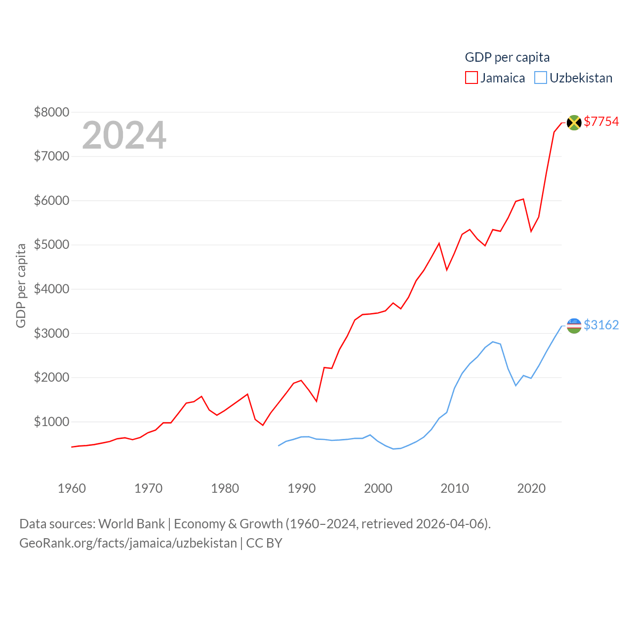 By GDP, Jamaica ranks 124/197 ($22B) and Uzbekistan ranks 66/197 ($115B). By GDP per capita, Jamaica ranks 95/197 ($7,754), while Uzbekistan ranks 139/197 ($3,162).