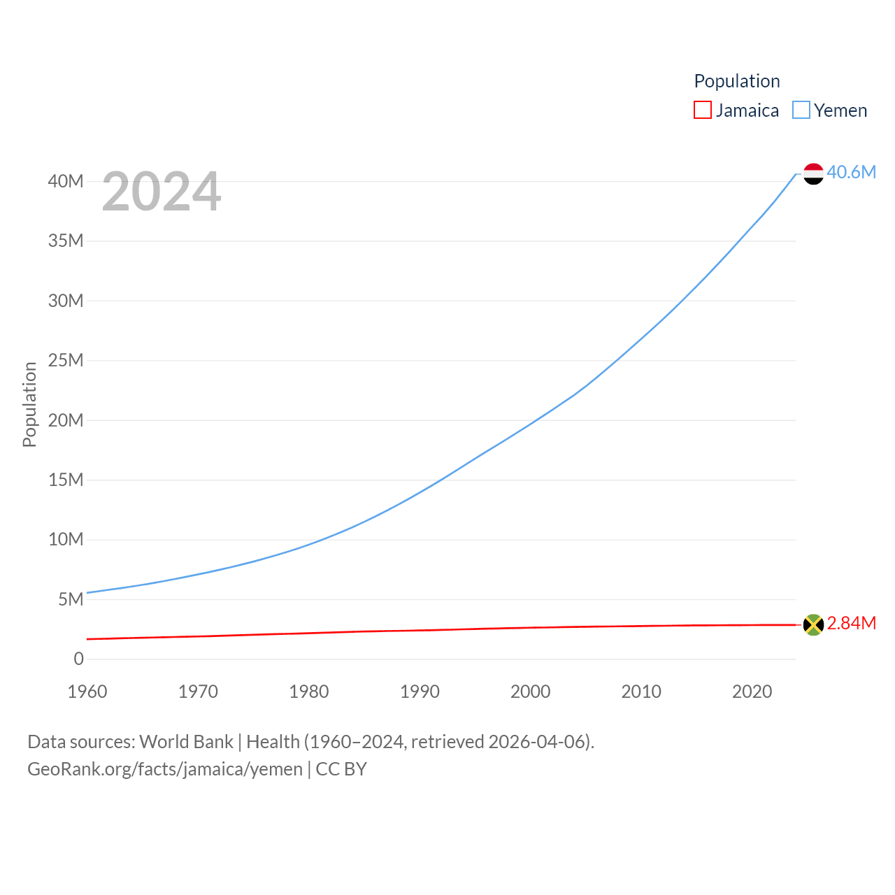 Jamaica has a population of 2.84M (ranked 139/197), compared with 40.6M in Yemen (ranked 38/197). Jamaica's land area is 4,181 sq mi versus 203,850 sq mi for Yemen (ranked 159th vs. 49th).