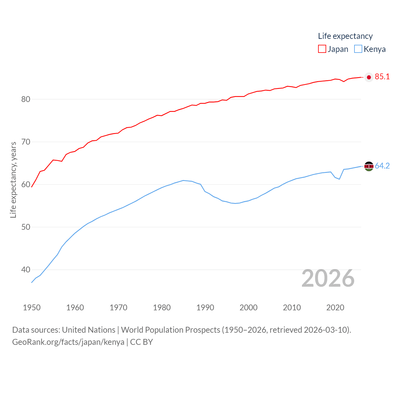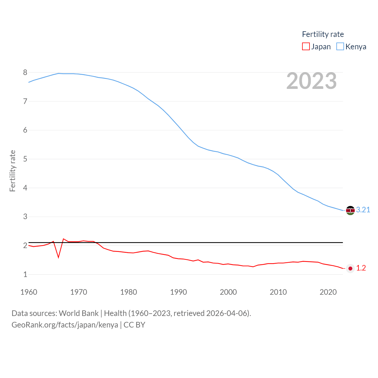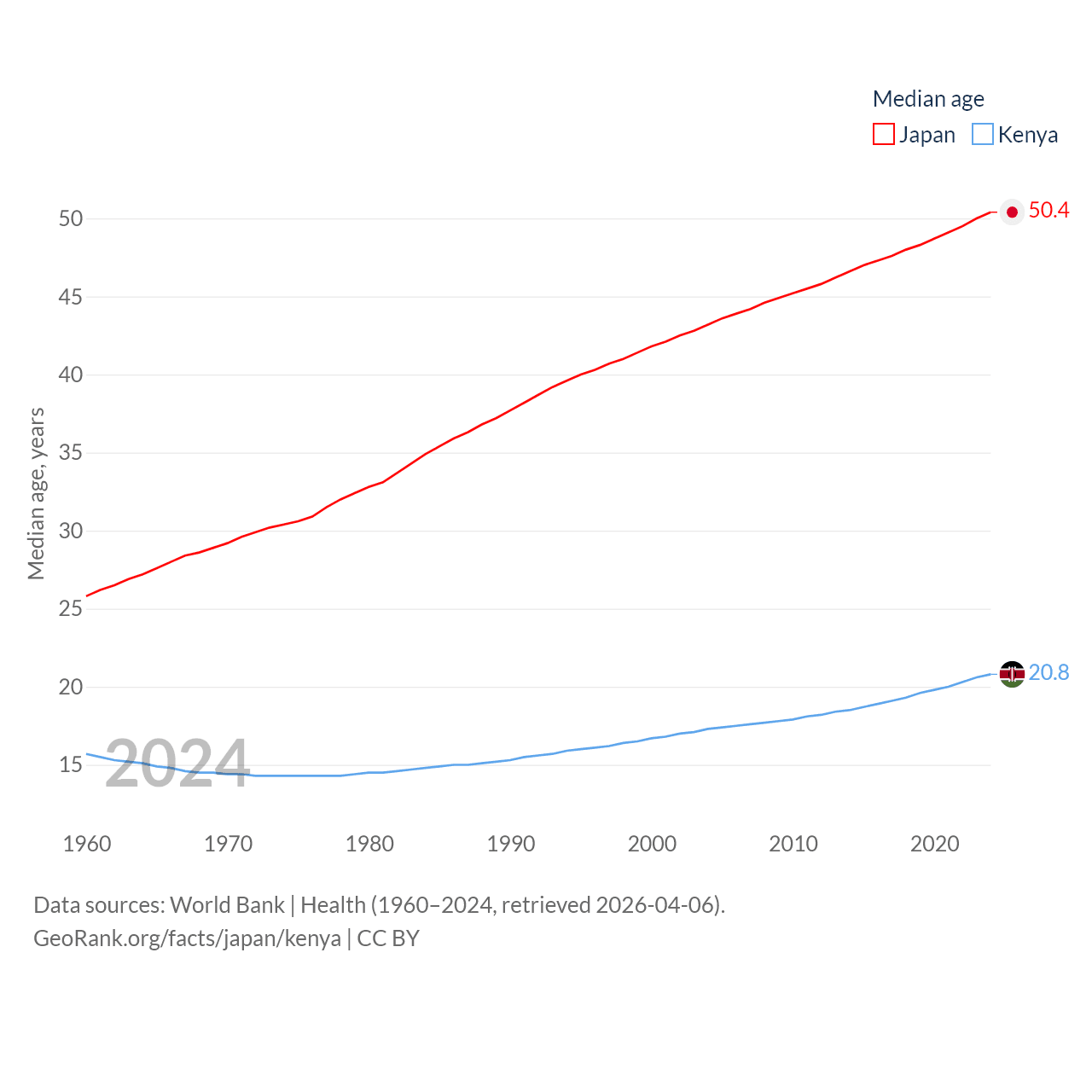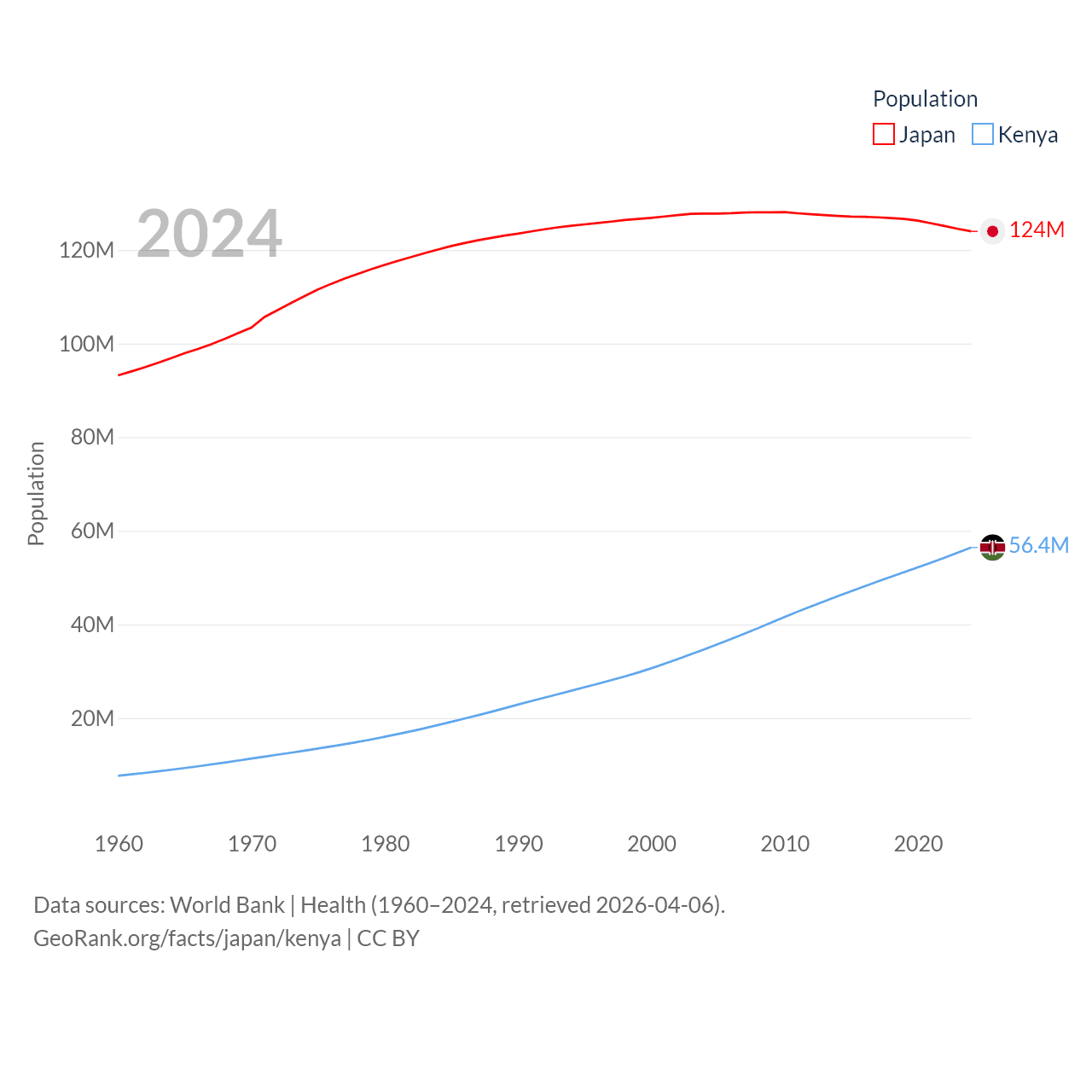 Japan has a population of 124M (ranked 12/197), compared with 56.4M in Kenya (ranked 26/197). Japan's land area is 140,761 sq mi versus 224,278 sq mi for Kenya (ranked 61st vs. 45th).