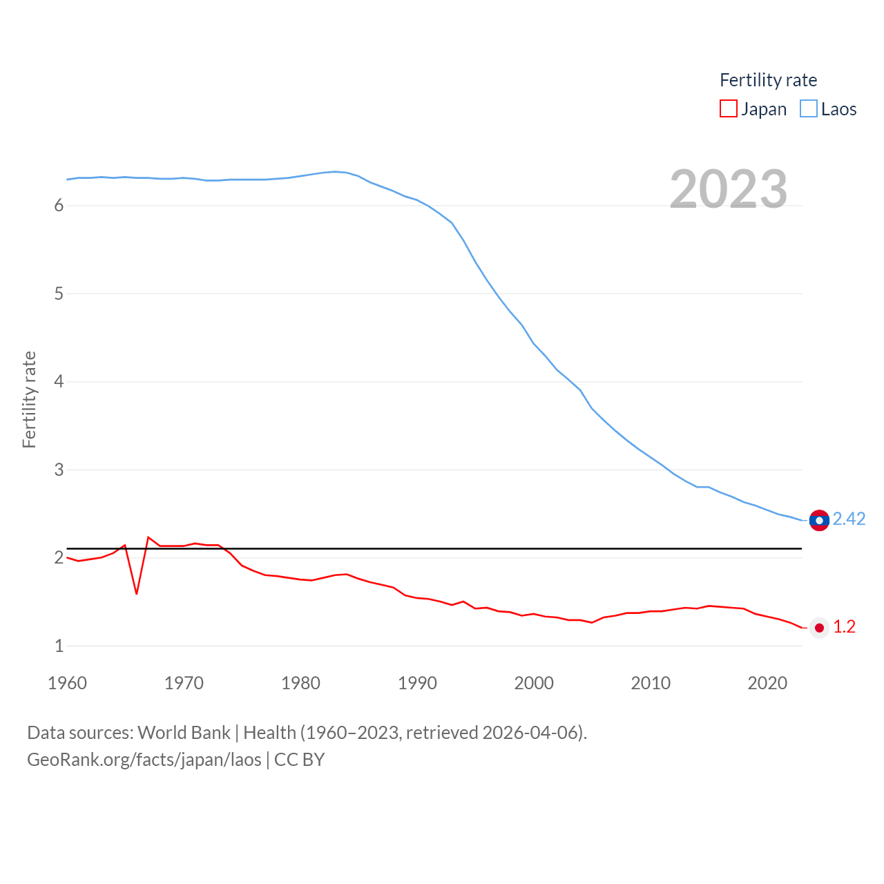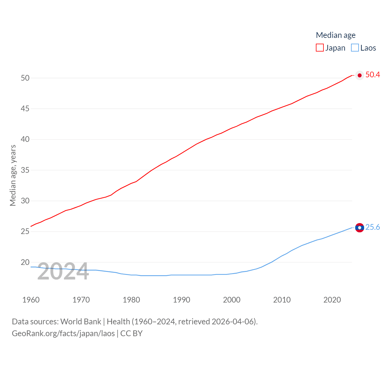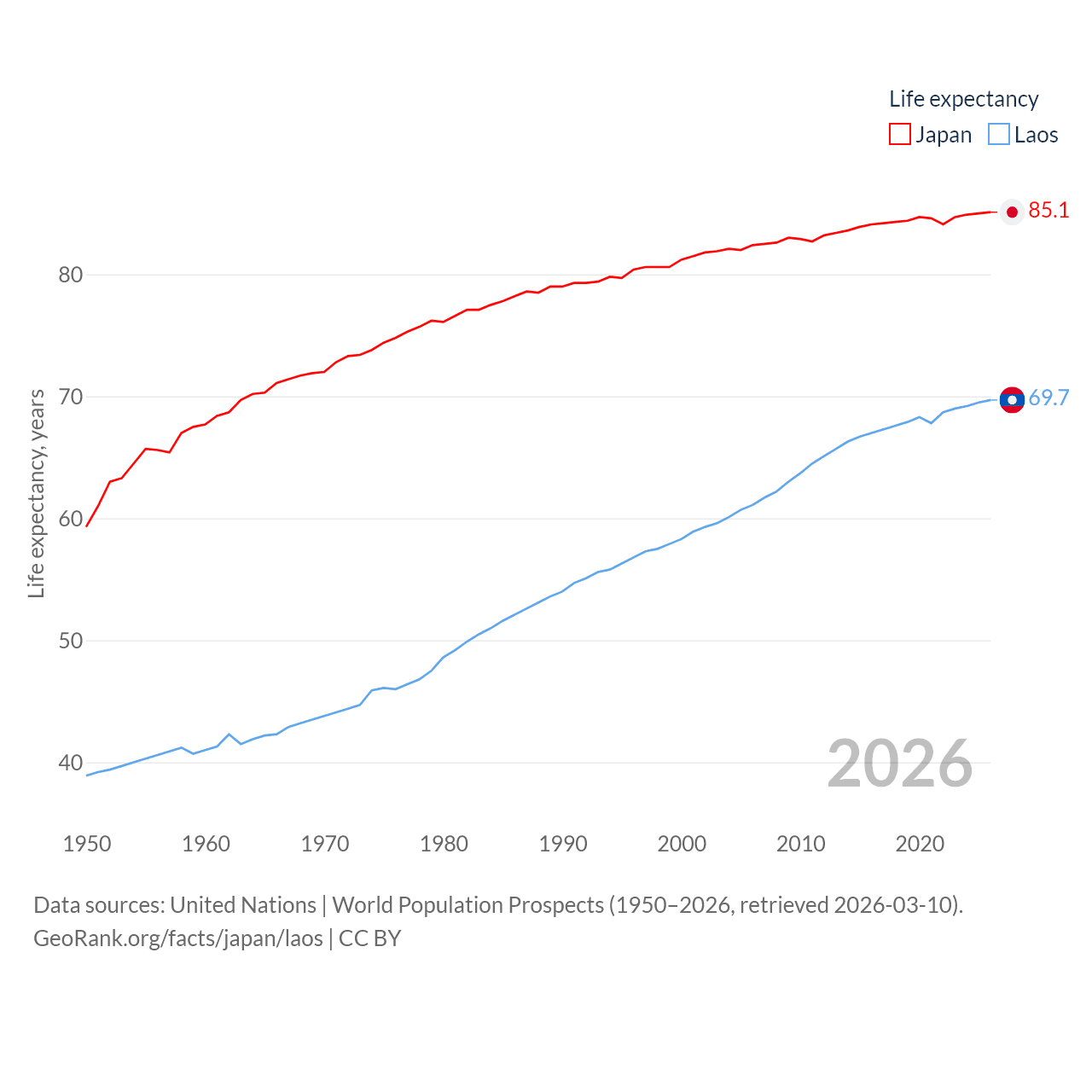 Japan has a population of 124M (ranked 12/197), compared with 7.77M in Laos (ranked 103/197). Japan's land area is 140,761 sq mi versus 89,112 sq mi for Laos (ranked 61st vs. 79th).
