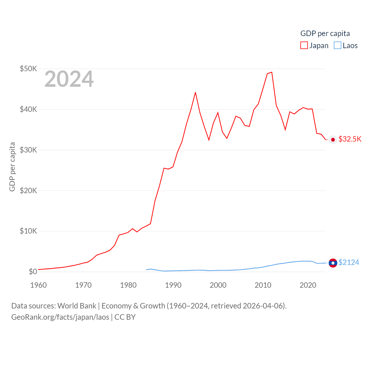 By GDP, Japan ranks 4/197 ($4.03T) and Laos ranks 139/197 ($16.5B). By GDP per capita, Japan ranks 38/197 ($32,487), while Laos ranks 155/197 ($2,124).