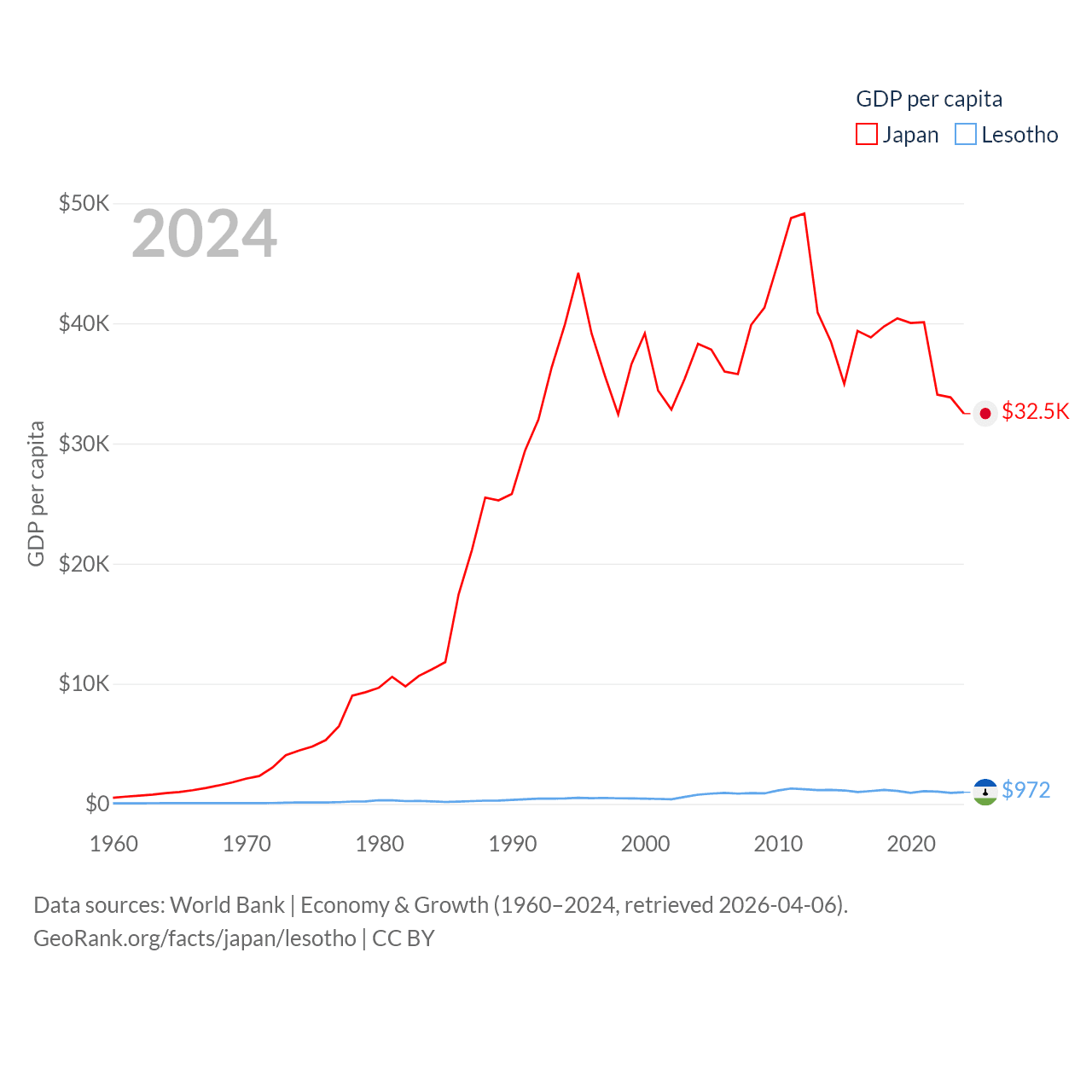 By GDP, Japan ranks 4/197 ($4.03T) and Lesotho ranks 175/197 ($2.27B). By GDP per capita, Japan ranks 38/197 ($32,487), while Lesotho ranks 181/197 ($972).
