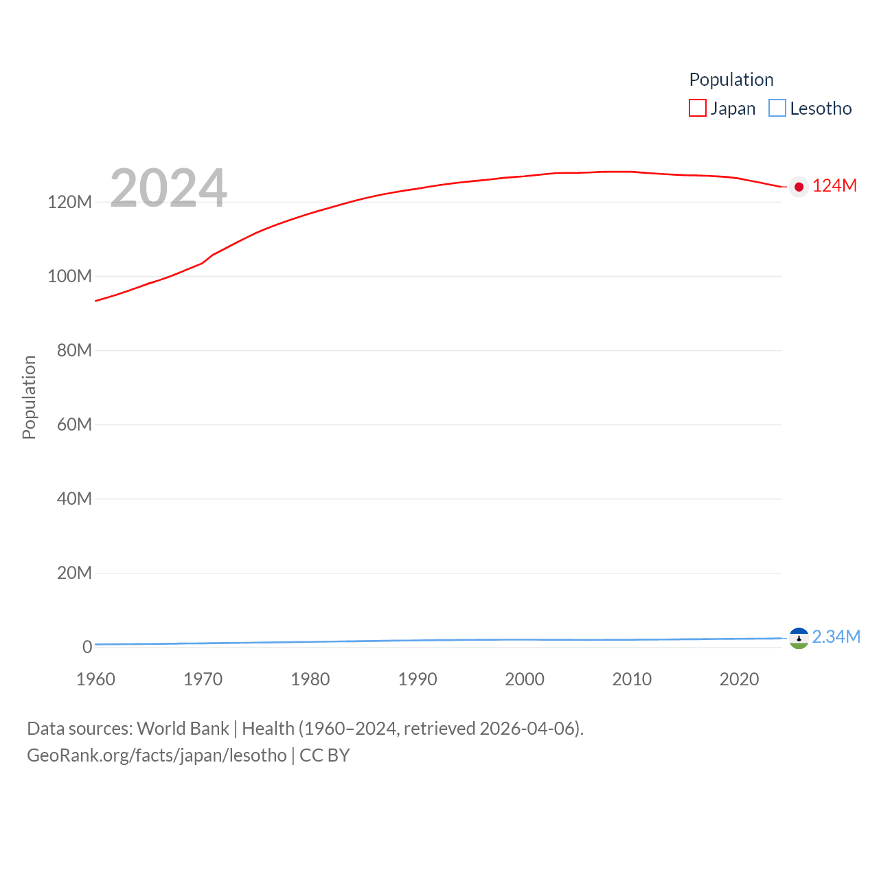 Japan has a population of 124M (ranked 12/197), compared with 2.34M in Lesotho (ranked 145/197). Japan's land area is 140,761 sq mi versus 11,722 sq mi for Lesotho (ranked 61st vs. 137th).