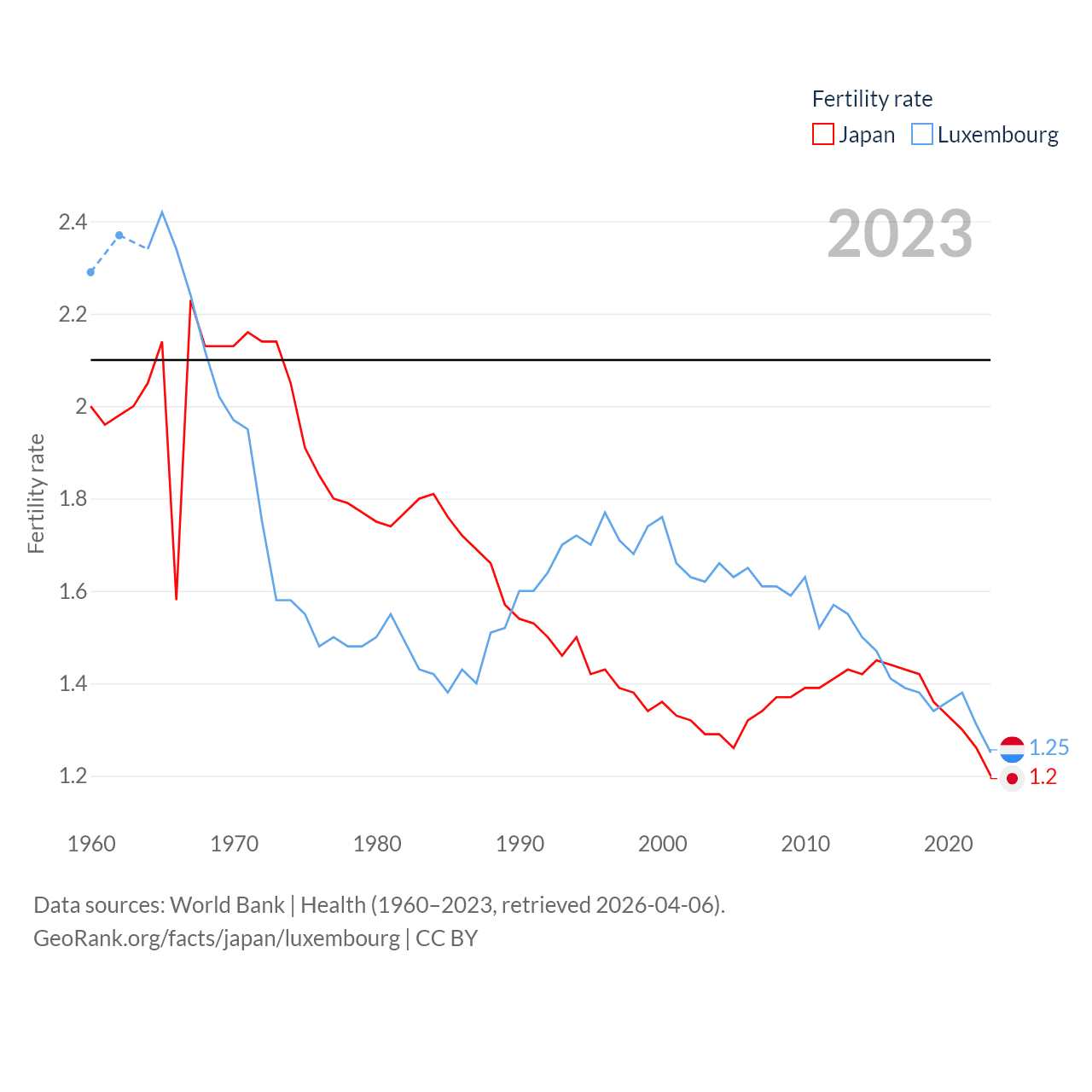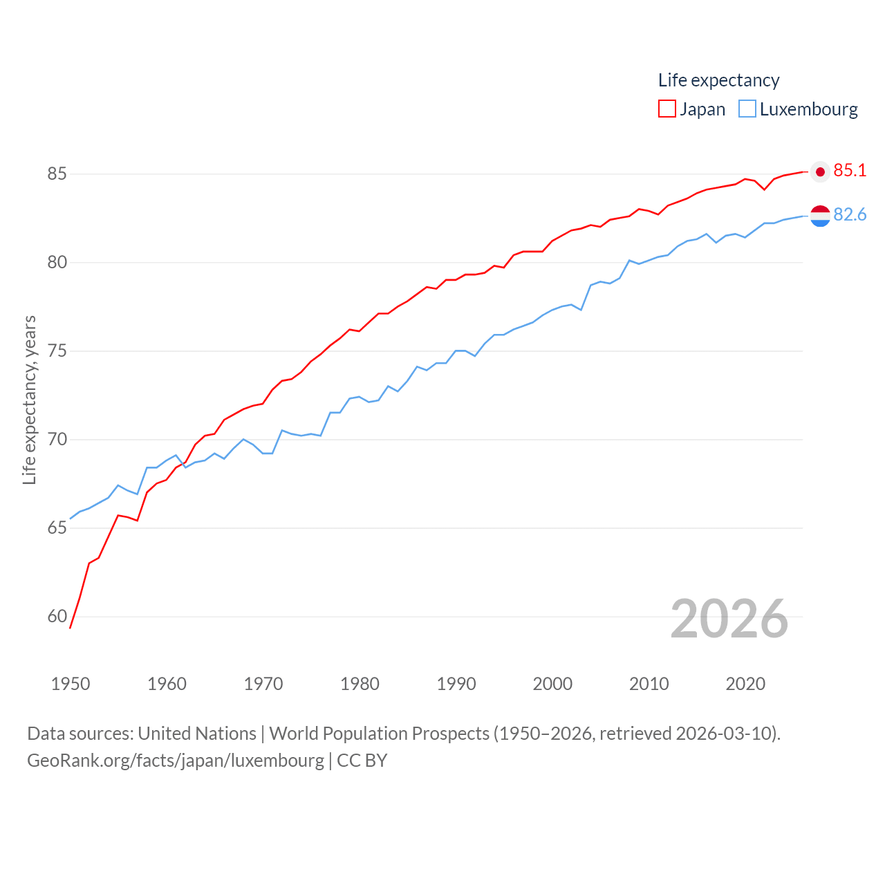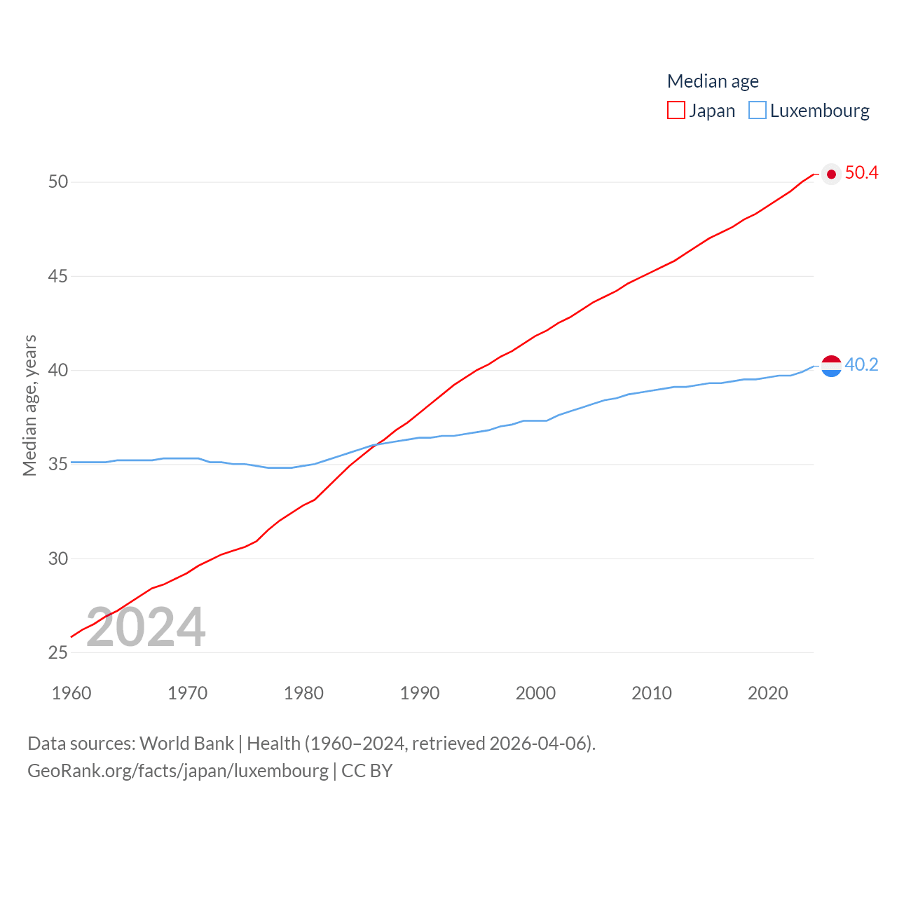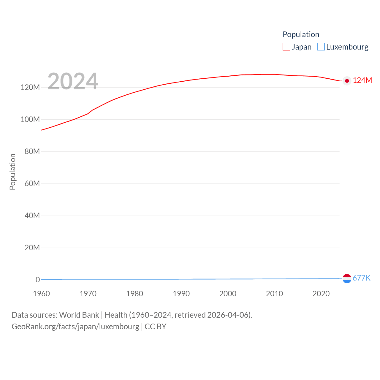 Japan has a population of 124M (ranked 12/197), compared with 677K in Luxembourg (ranked 164/197). Japan's land area is 140,761 sq mi versus 994 sq mi for Luxembourg (ranked 61st vs. 169th).