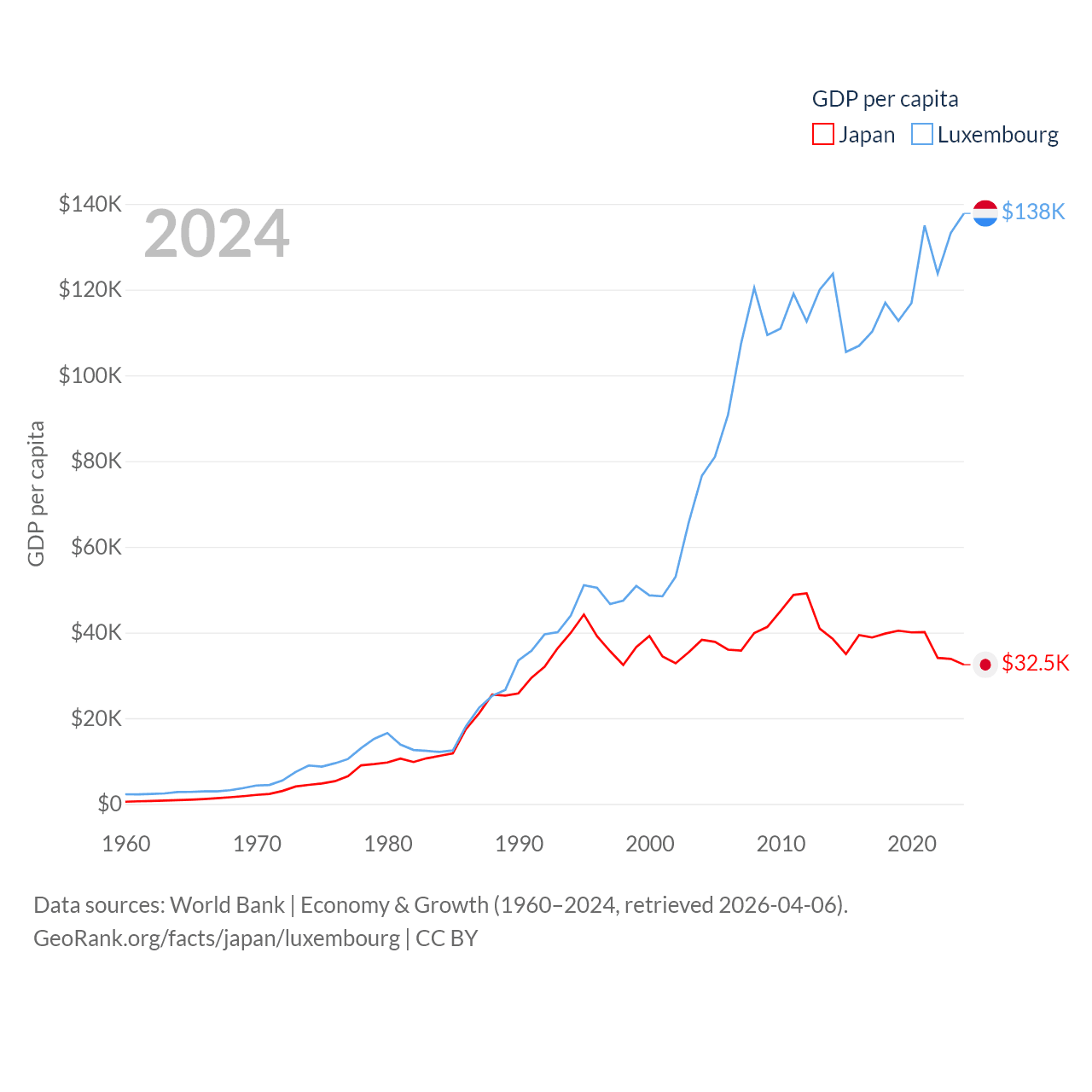 By GDP, Japan ranks 4/197 ($4.03T) and Luxembourg ranks 74/197 ($93.3B). By GDP per capita, Japan ranks 38/197 ($32,487), while Luxembourg ranks 3/197 ($137,782).
