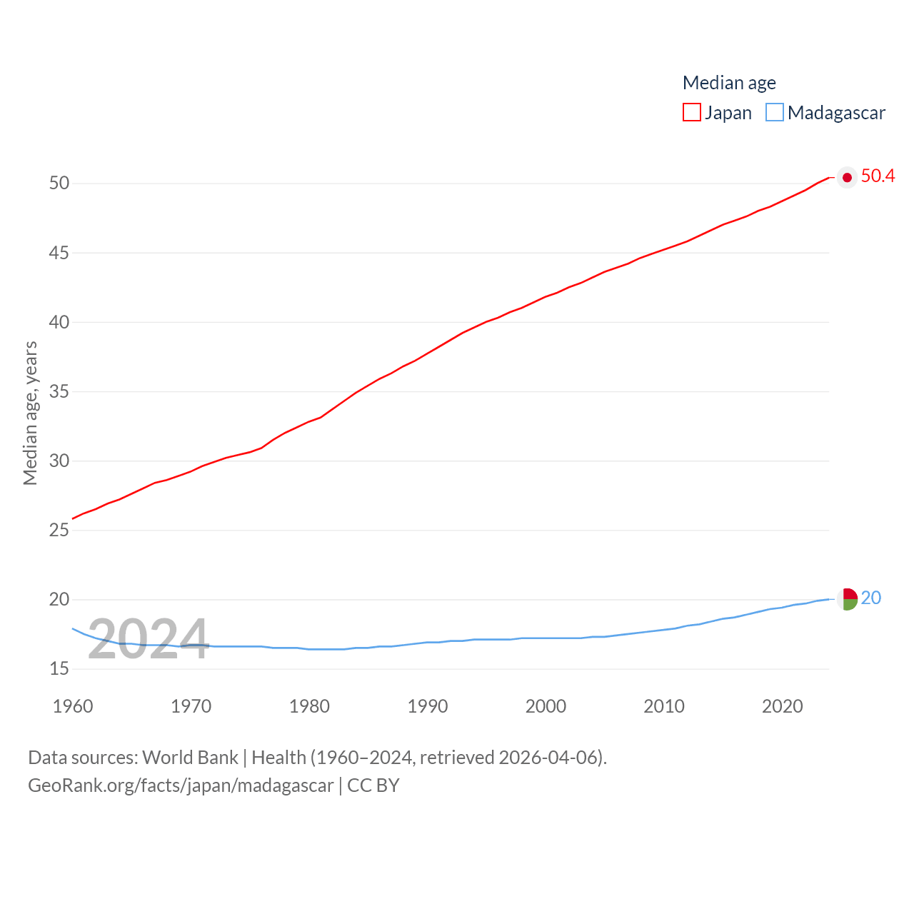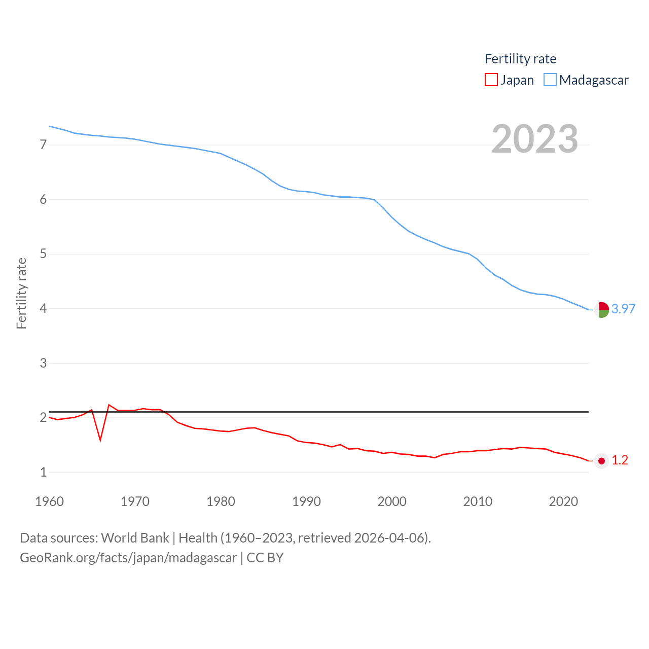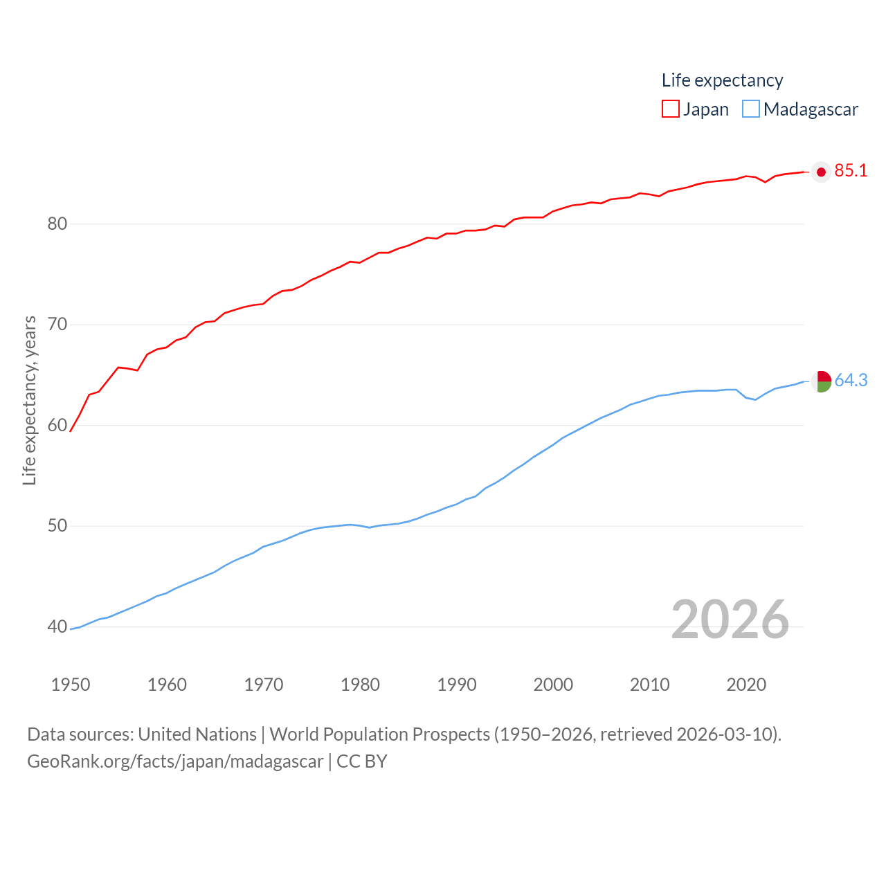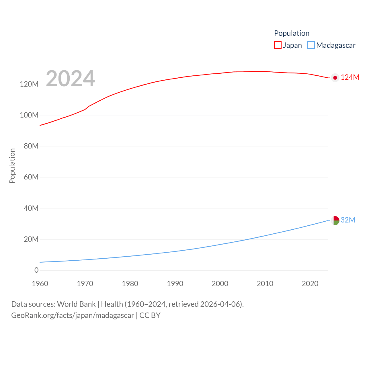 Japan has a population of 124M (ranked 12/197), compared with 32M in Madagascar (ranked 49/197). Japan's land area is 140,761 sq mi versus 224,634 sq mi for Madagascar (ranked 61st vs. 44th).