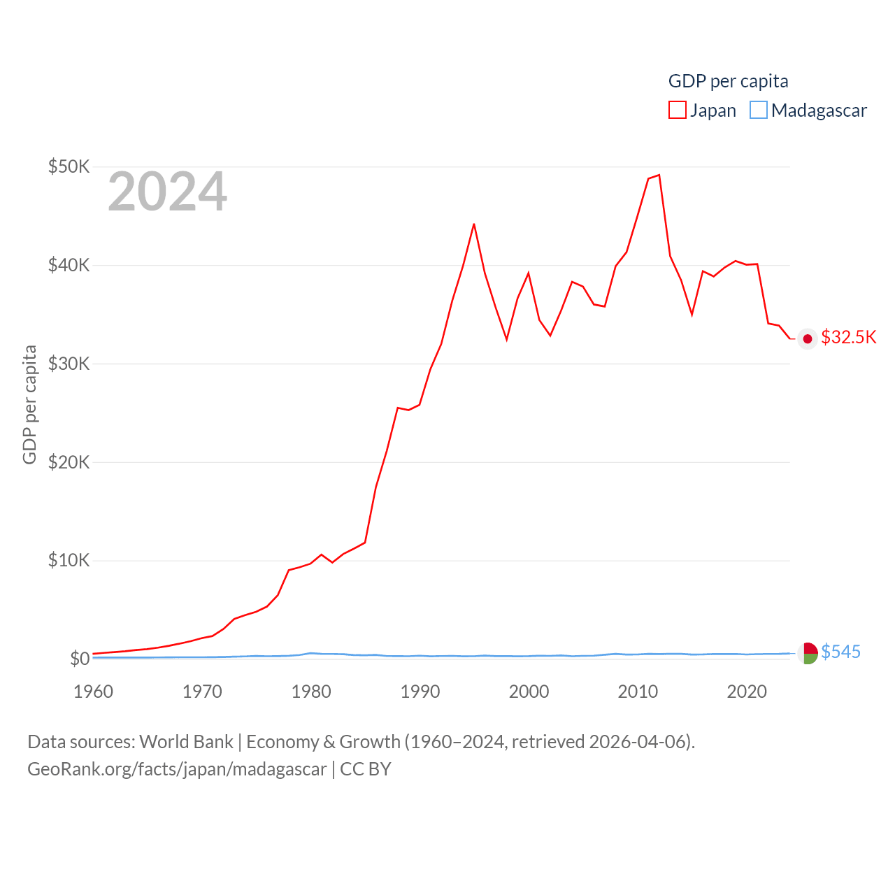 By GDP, Japan ranks 4/197 ($4.03T) and Madagascar ranks 136/197 ($17.4B). By GDP per capita, Japan ranks 38/197 ($32,487), while Madagascar ranks 193/197 ($545).