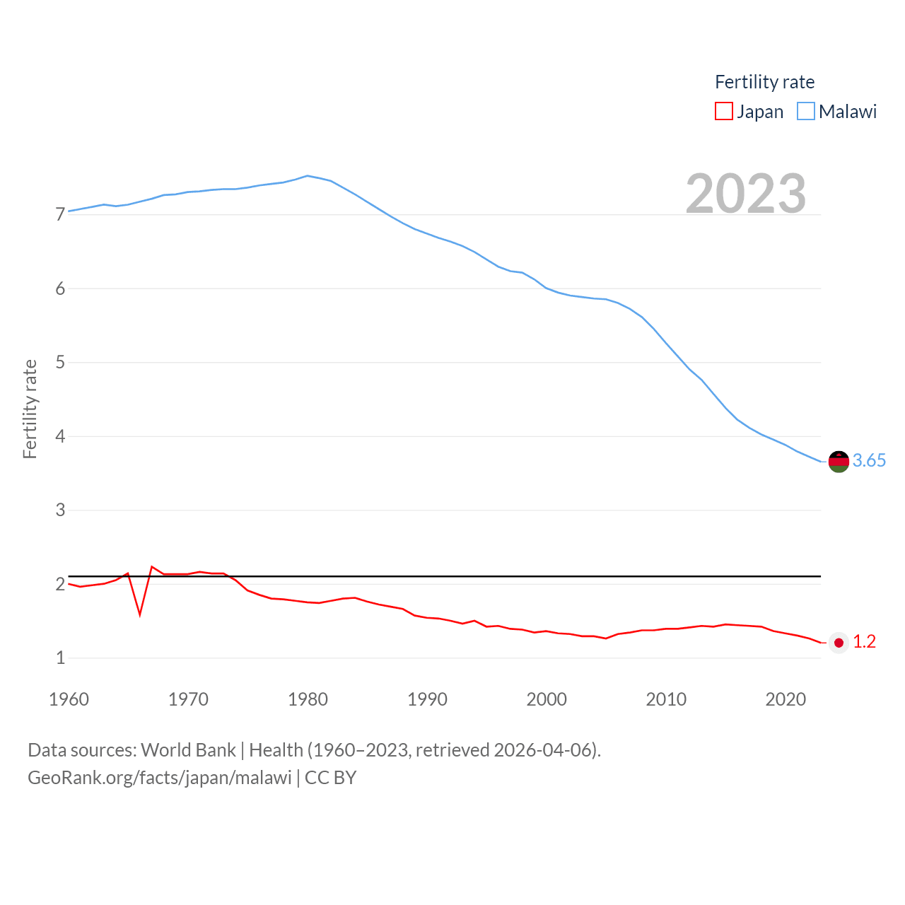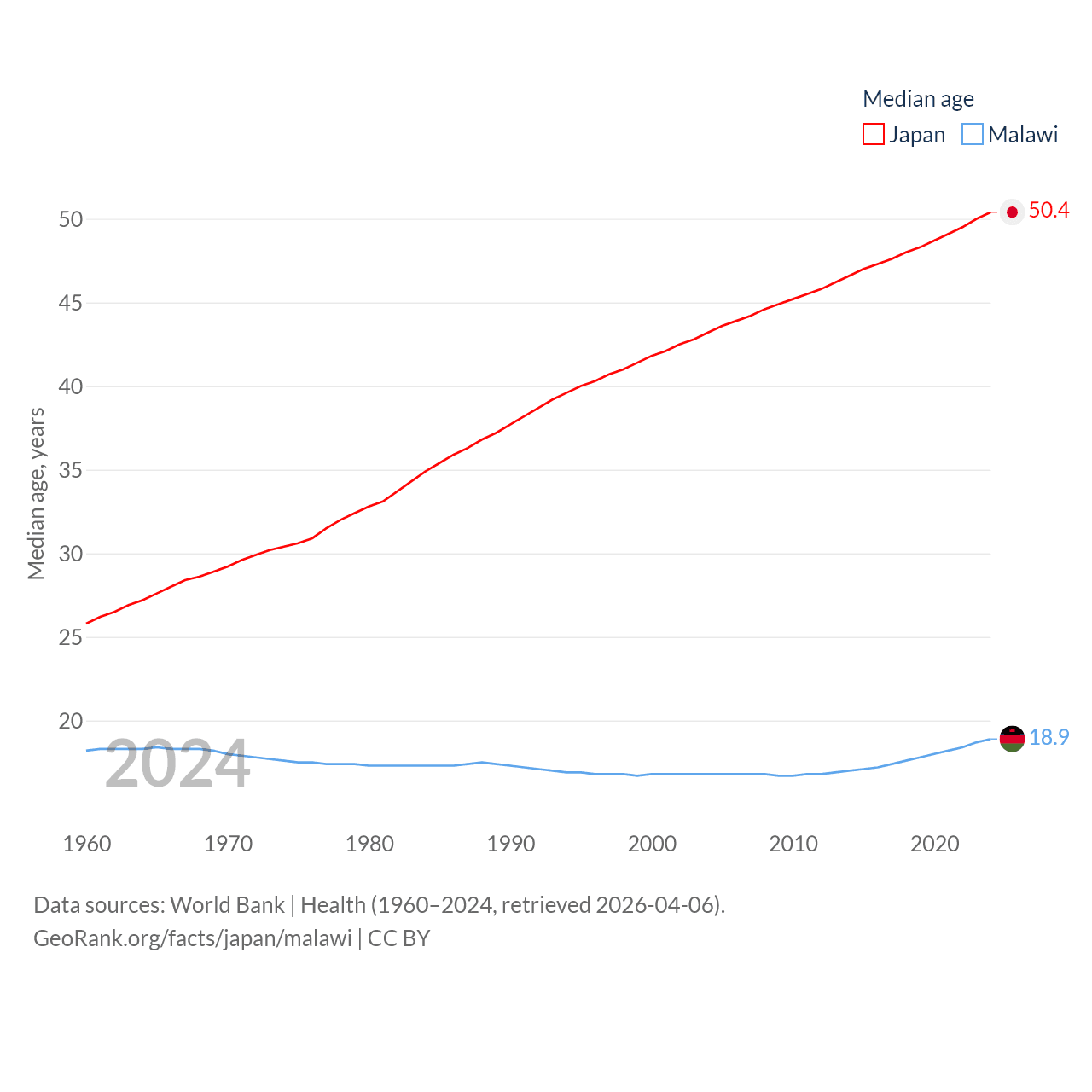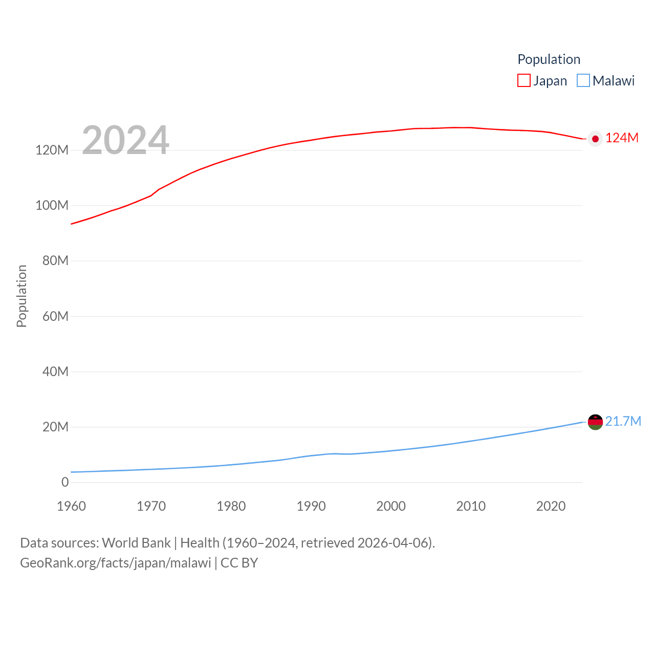Japan has a population of 124M (ranked 12/197), compared with 21.7M in Malawi (ranked 62/197). Japan's land area is 140,761 sq mi versus 36,402 sq mi for Malawi (ranked 61st vs. 107th).