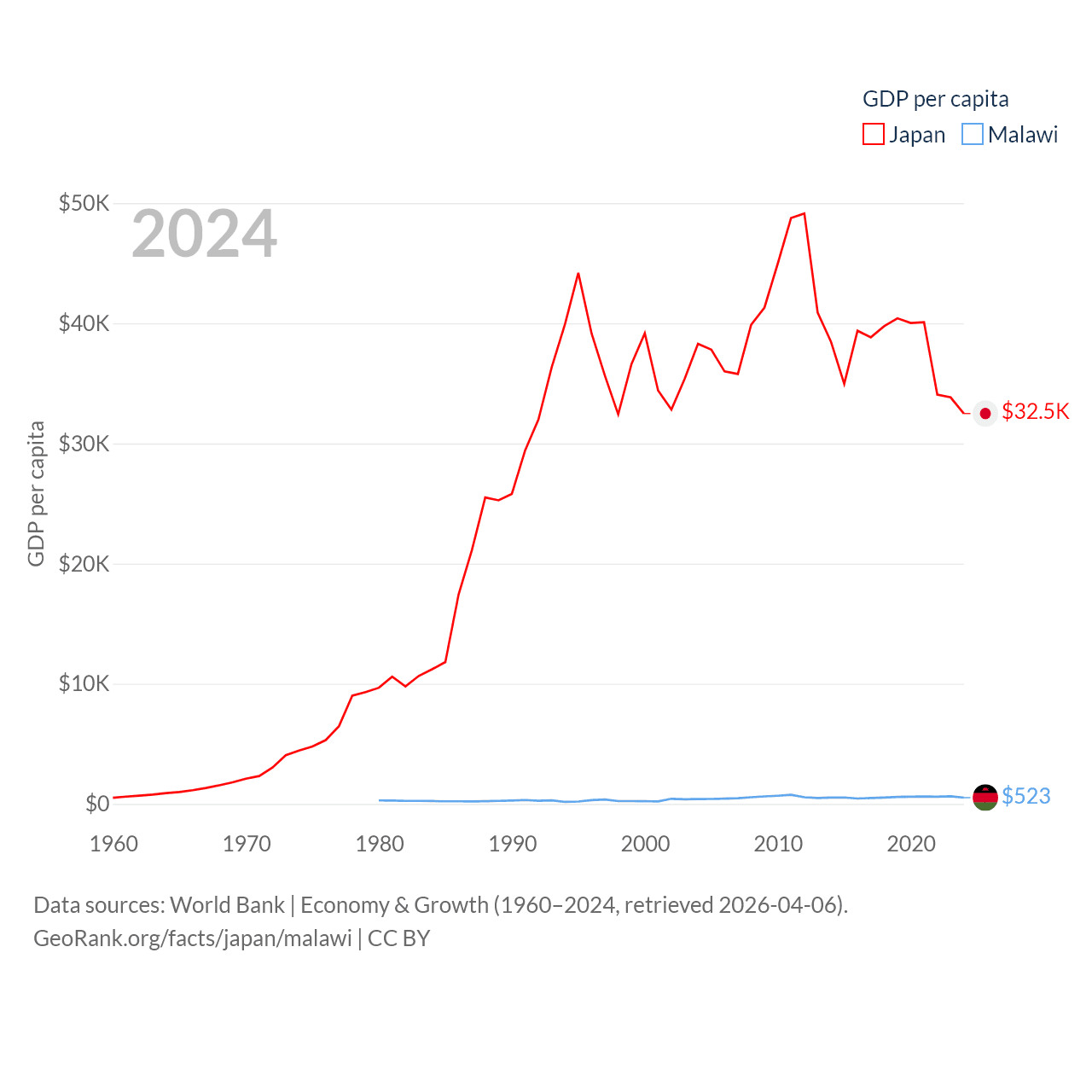 By GDP, Japan ranks 4/197 ($4.03T) and Malawi ranks 151/197 ($11.3B). By GDP per capita, Japan ranks 38/197 ($32,487), while Malawi ranks 194/197 ($523).